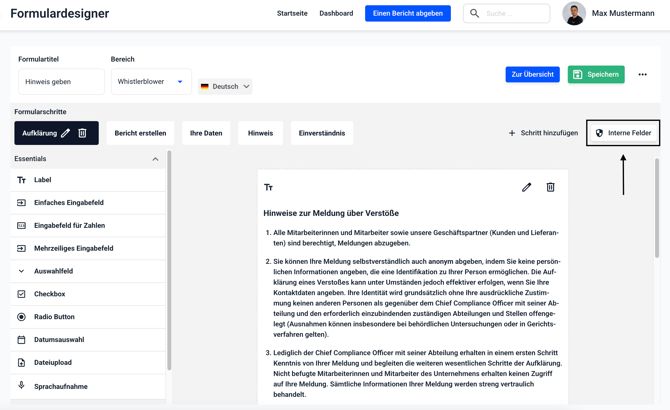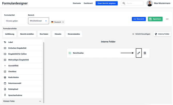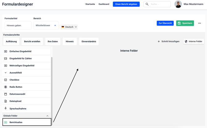 Wählen Sie in der Felderauswahl den Schritt Berichtsalias und ziehen Sie ihn mit Hilfe der Maus in das Feld Interne Felder.