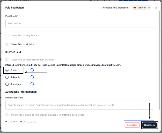 Klicken Sie auf Primär. Dieser Schritt ermöglicht die Ausgabe des Berichtsalias unter den Berichtsinformationen und auf dem Dashboard. Bestätigen Sie die Änderung anschließend mit Speichern.