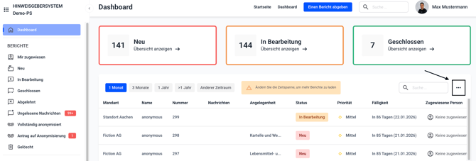 Globale Felder können optional im Dashboard als zusätzliche Spalte angezeigt werden. Hierfür navigieren Sie zum Dashboard und klicken Sie auf die drei Punkte.