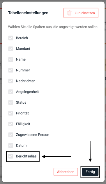 Wählen Sie das Feld Berichtsalias aus und bestätigen Sie dies auf Fertig.