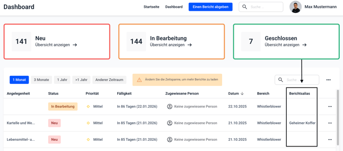 Der Berichtsalias wird auf dem Dashboard als zusätzliche Spalte angezeigt.
