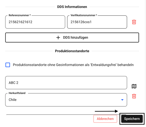 Wenn Sie zu einem Produkt bereits ein DDS vorliegen haben, wurde die Geodatenüberprüfung bereits durchgeführt. Sobald Sie innerhalb der Charge eine Referenznummer und eine Verifikationsnummer hinterlegen, wird die Geodatenüberprüfung automatisch in Ihre Charge übernommen.