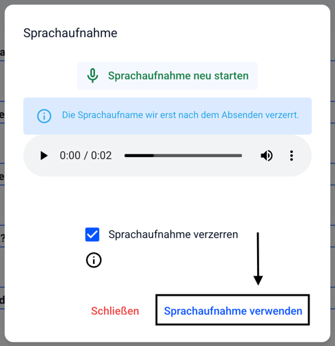 Der Hinweisgeber hat die Möglichkeit, seine Angaben auch als Sprachaufnahme zu hinterlegen. Diese Aufnahme kann verzehrt werden, um die Anonymität zu gewähren.