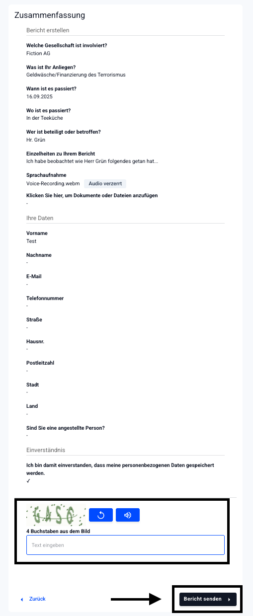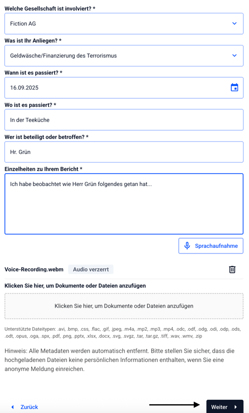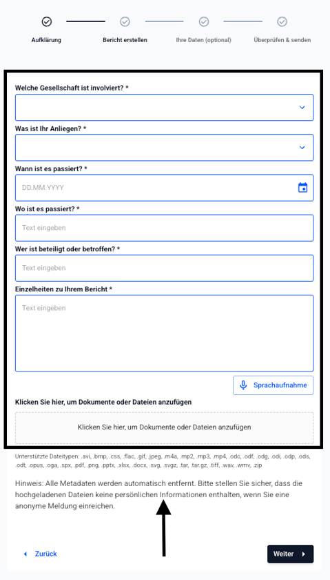 Der Hinweisgeber muss nun alle Fragen beantworten und kann ein Dokument hochladen oder eine Sprachaufnahme tätigen.