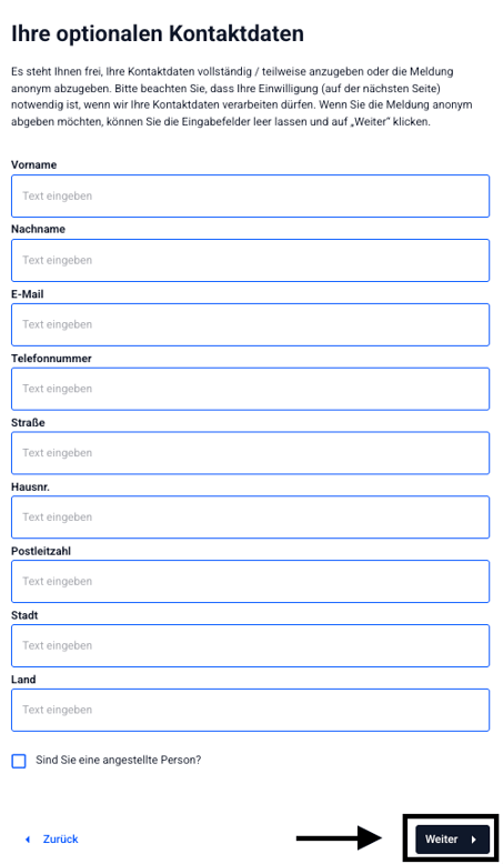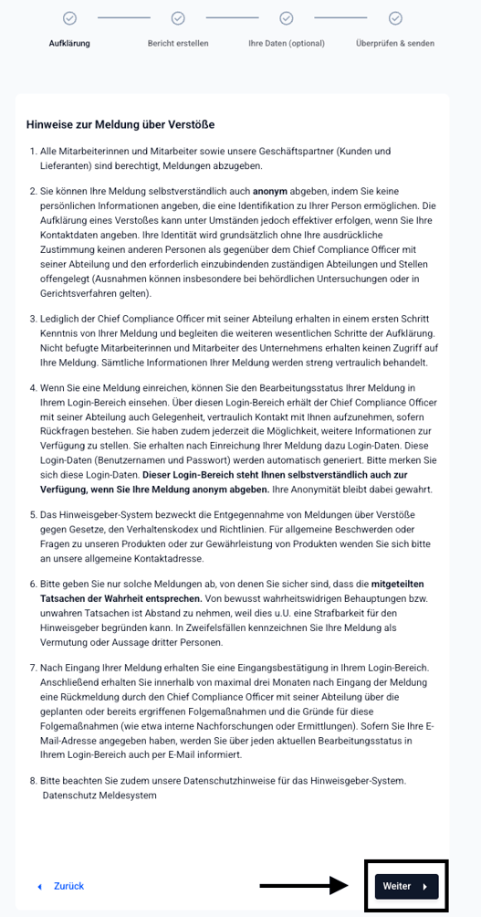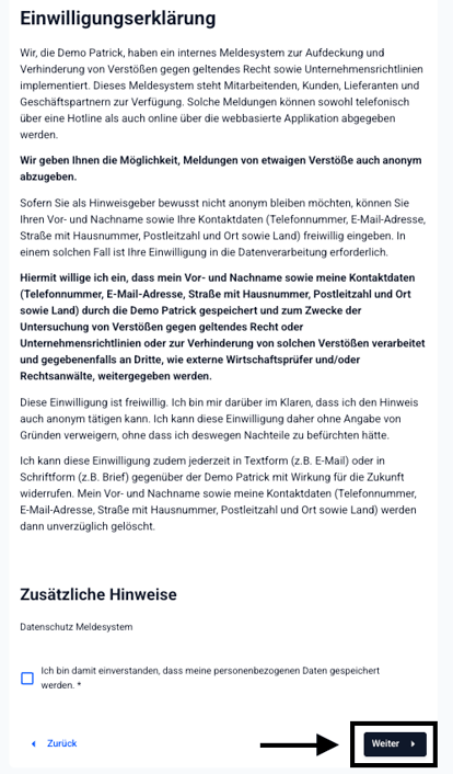 Nach der Eingabe aller Informationen muss der Hinweisgeber auf "Weiter" klicken.