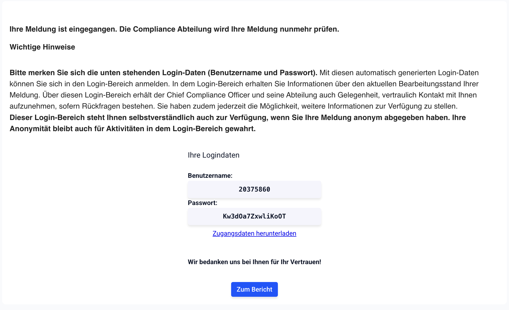 Die oder der Hinweisgebende wird über den automatischen Download der Zugangsdaten informiert.