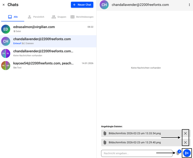 Die ausgewählten Dateien werden Ihnen nun angezeigt. Sie können über das X eine falsch ausgewählte Datei entfernen oder auf das Symbol mit dem blauen Kreis die Nachrichten dauerhaft diesem Chat zuordnen.