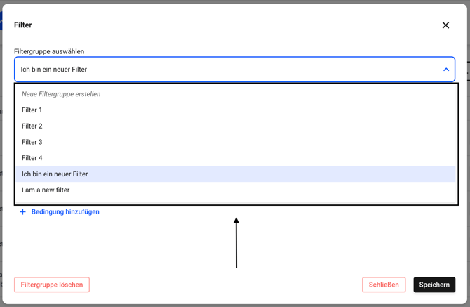 Wählen Sie jetzt die gewünschte Filtergruppe, bei der Sie den Namen ändern möchten. Klicken Sie dafür auf das Drop Down Menü bei Filtergruppe auswählen.