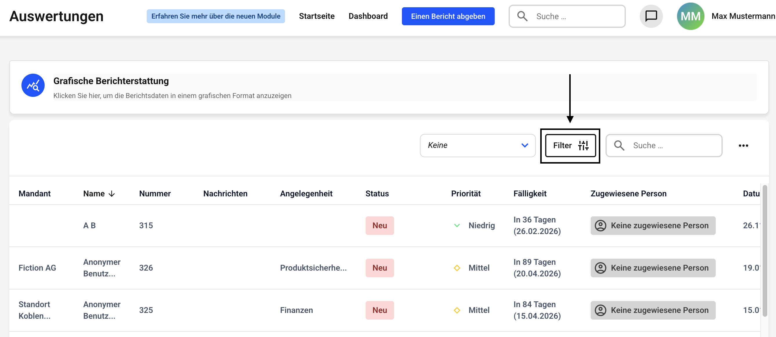 Um bei den grafischen Auswertungen einen neuen Filter anzulegen, klicken Sie zunächst auf Grafische Auswertungen.
