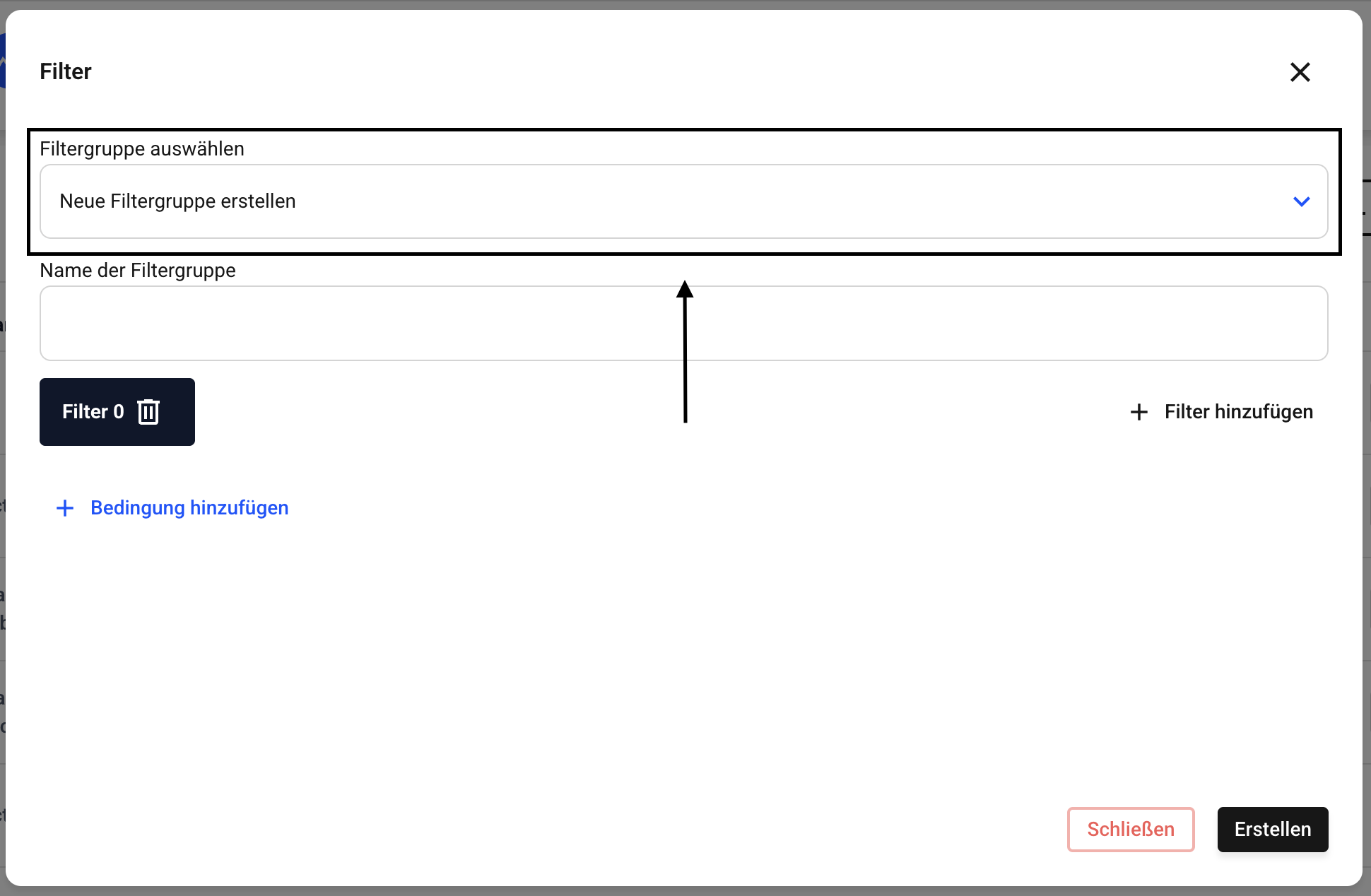 Lassen Sie nun die bereits bestehende Eingabe bei Filtergruppe auswählen unangetastet, da somit ein neuer Filter erstellt wird.