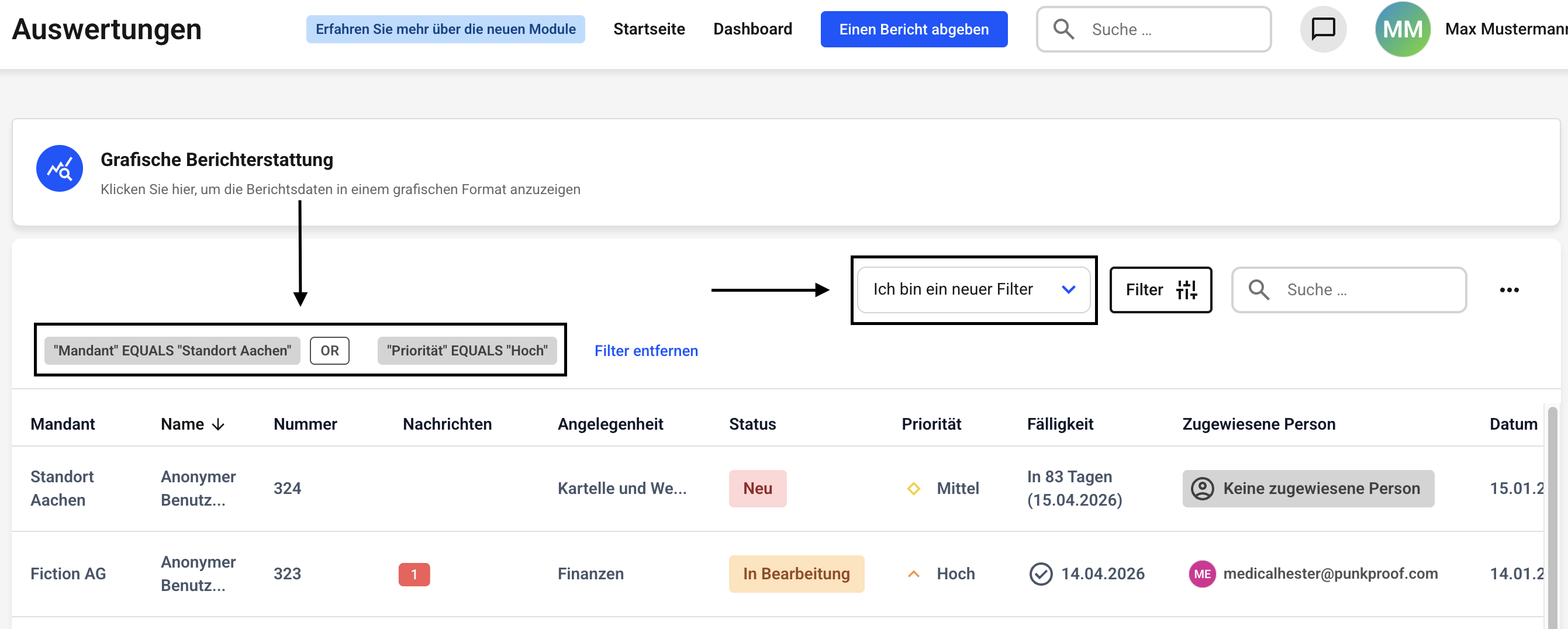Wenn Sie einen UND-Filter verwenden, suchen Sie z.B. nach einem bestimmten Mandanten UND dem Status Neu. Somit erhalten Sie alle Ergebnisse, die zum gewählten Mandanten gehören und den Status neu haben.