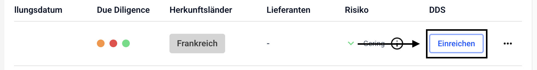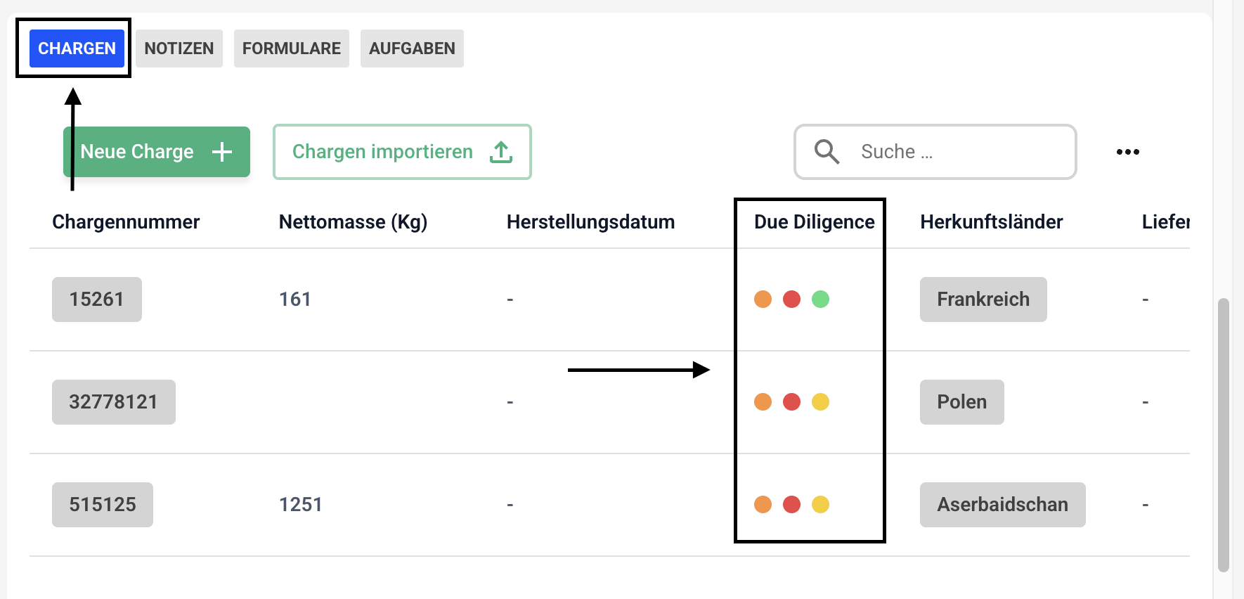 In dem Reiter Chargen können Sie in der Due Diligence Spalte mit farblichen Symbolen den aktuellen Due Diligence Stand einsehen.