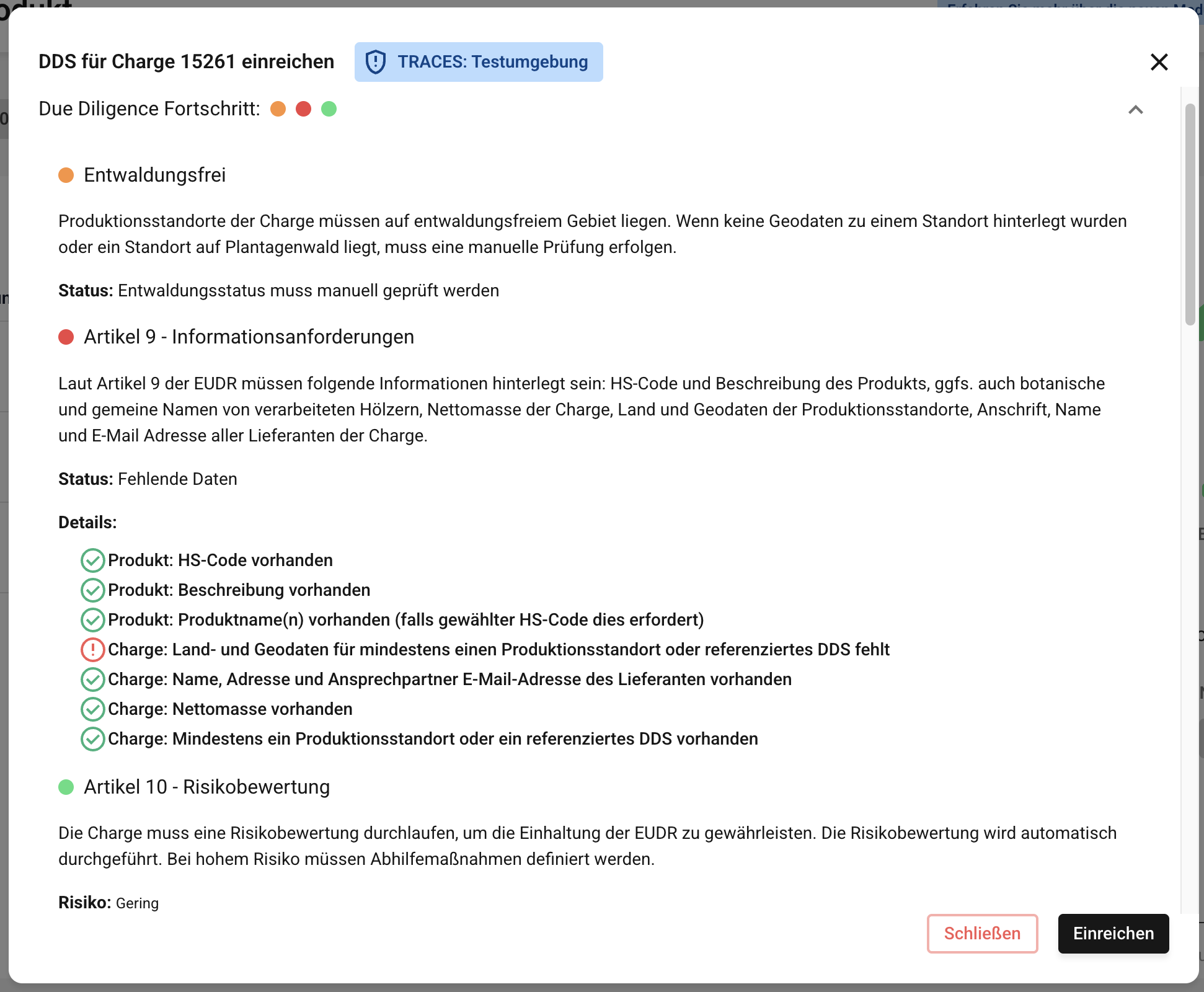 Wie kann ich den Due Diligence Fortschritt meiner Charge einsehen?
