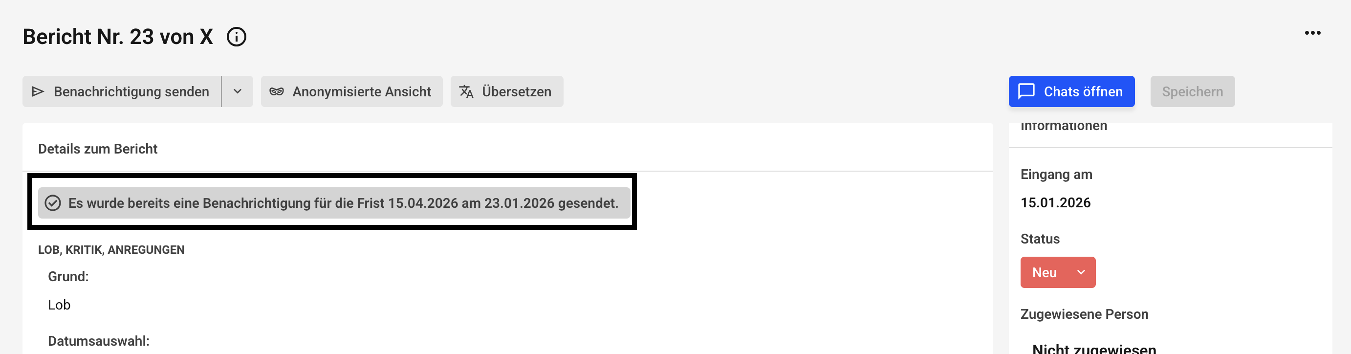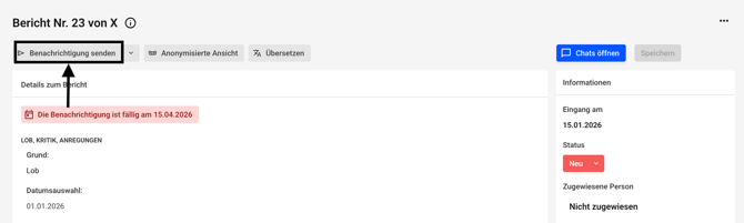 Nun erhalten Sie im Badge mit grauen Hintergrund den Hinweis das Sie die Benachrichtigung an Hinweisgeber gesendet haben.