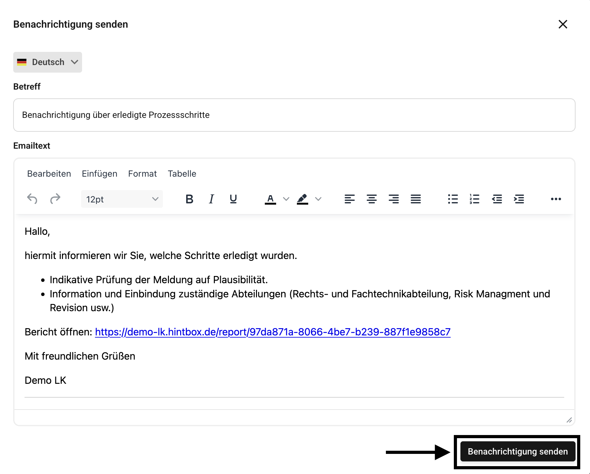 Anschließend öffnet sich ein Dialog der Ihnen schon eine Vorlage für die Benachrichtigung anzeigt. Im Beispiel sehen Sie schon eine automatisch generierte Maßnahme als Listenpunkt im Text aufgeführt. Der Dialog zieht sich automatisch den E-Mail-Text der abgehakten Prozessschritte. Mit einem Klick auf “Benachrichtigung senden“ wird die Benachrichtigung als E-Mail vom Hinweisgeber versendet sofern vorhanden und zusätzlich im Nachrichtenverlauf aufgeführt.