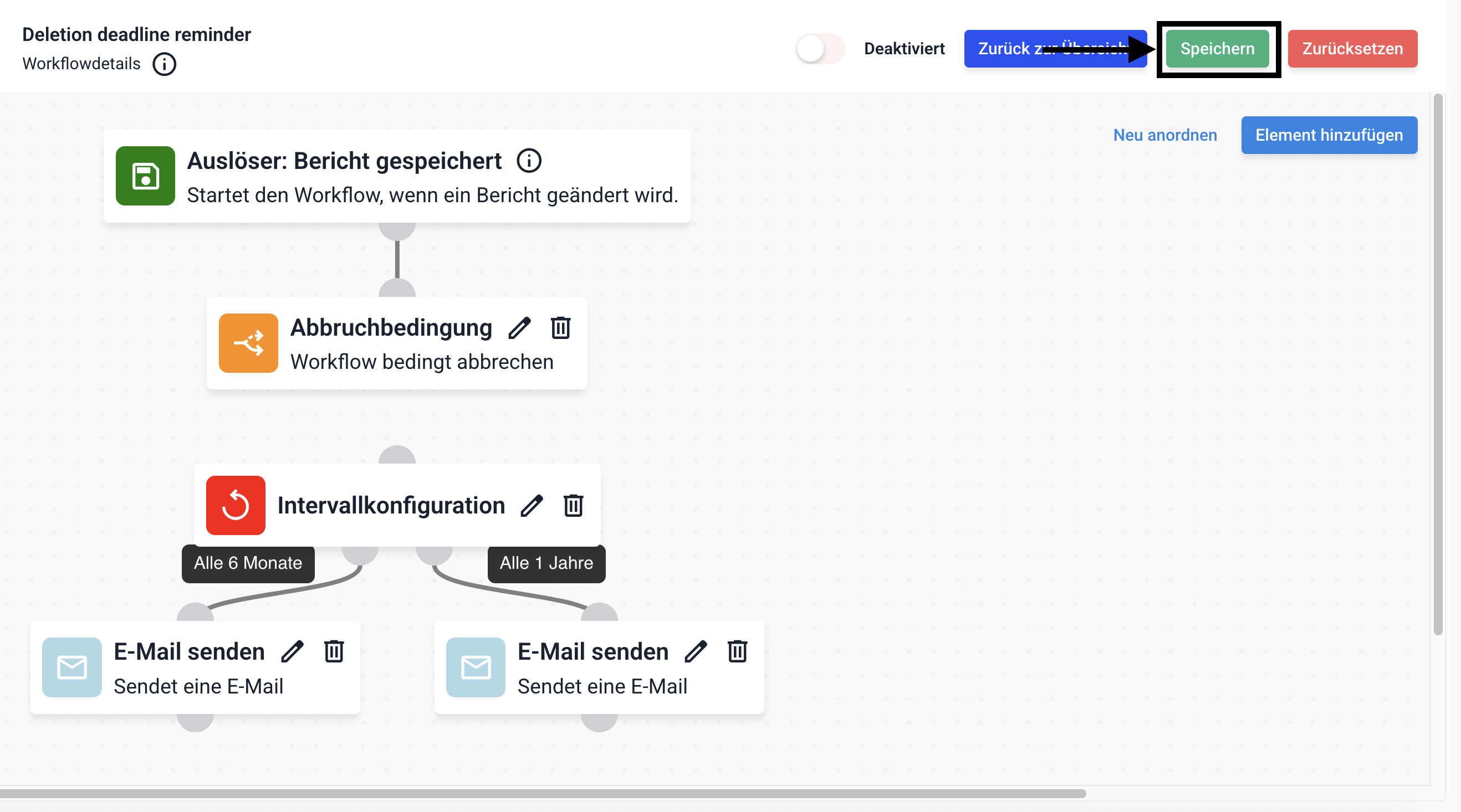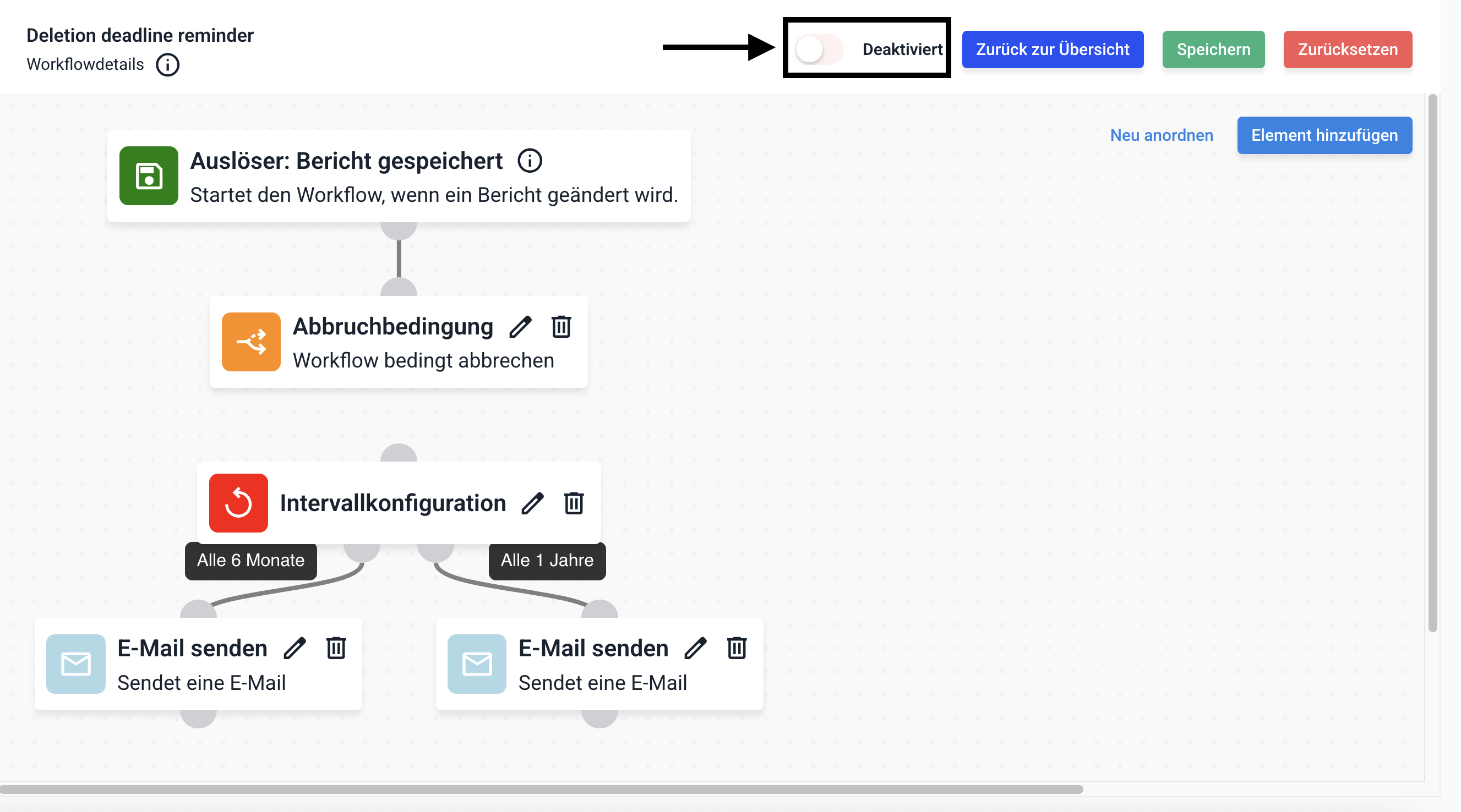 Sie erkennen dass der Workflow inaktiv ist, wenn der Regler deaktiviert anzeigt.