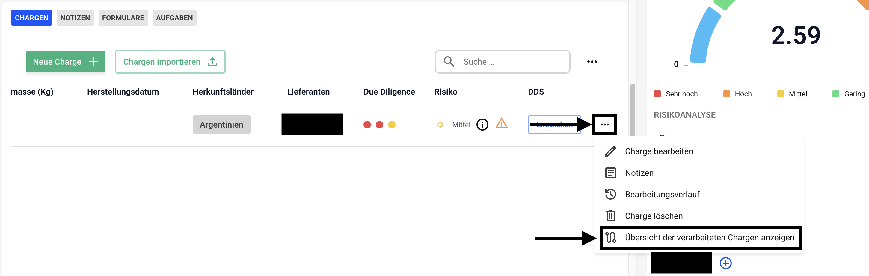 Innerhalb der Chargen-Übersicht Klicken Sie auf die drei Punkte und anschließend auf Übersicht der verarbeiteten Chargen anzeigen.