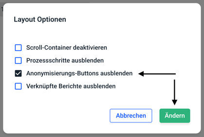 Wenn Sie den Anonymisierungs-Button deaktivieren möchten, setzen Sie den Haken bei der Checkbox von Anonymisierungs-Buttons ausblenden. Wenn Sie die Anonymisierungs-Buttons aktivieren möchten, entfernen Sie den Haken. Bestätigen Sie dies im Anschluss mit Ändern.
