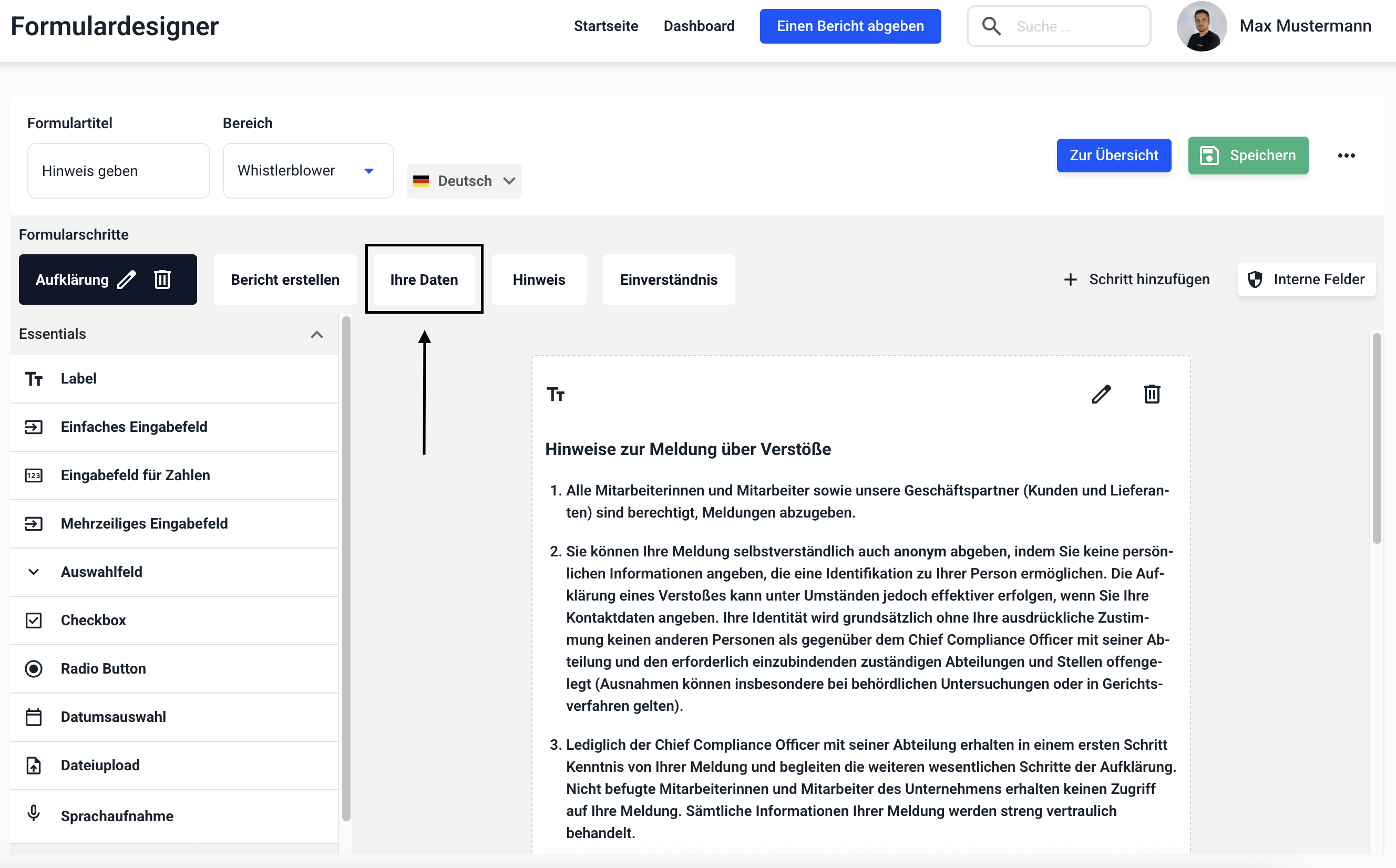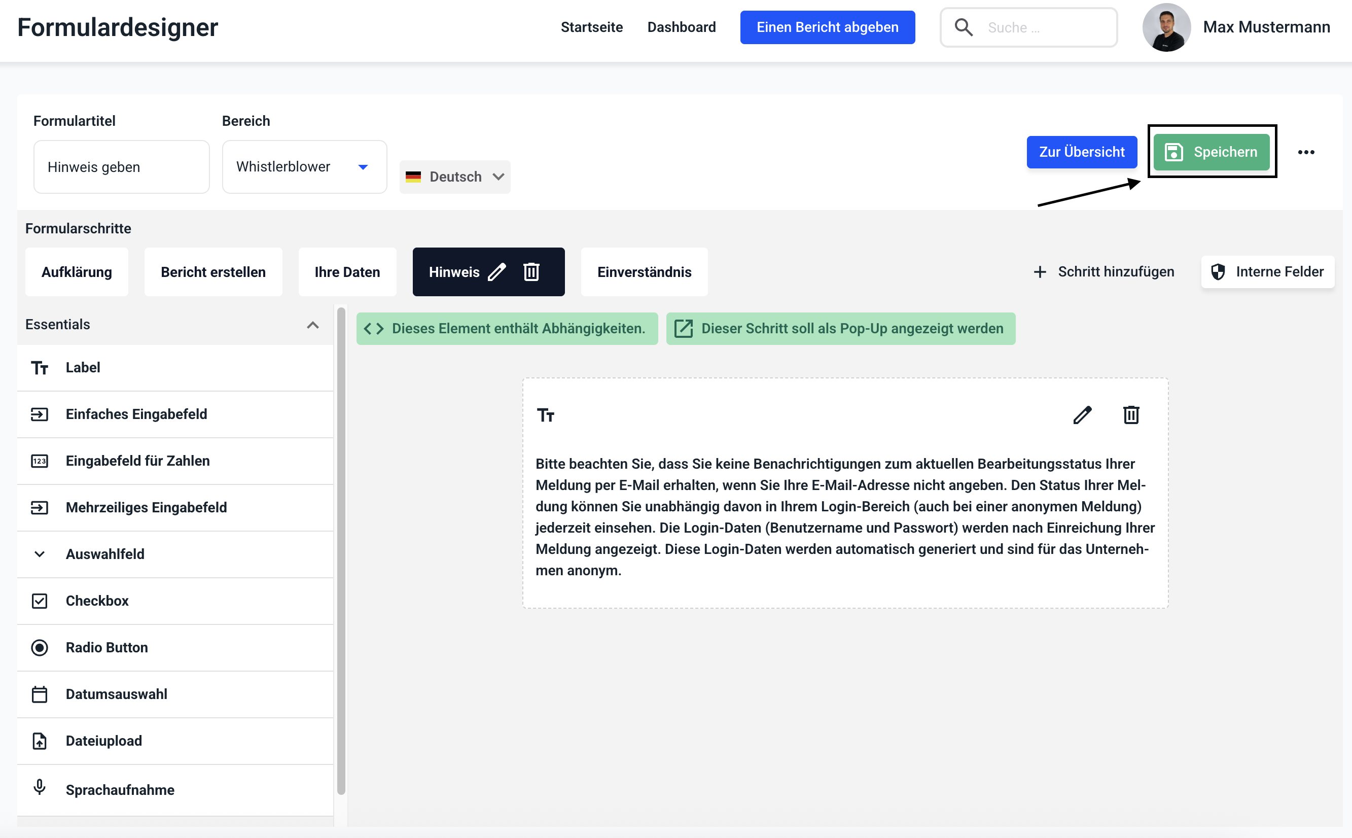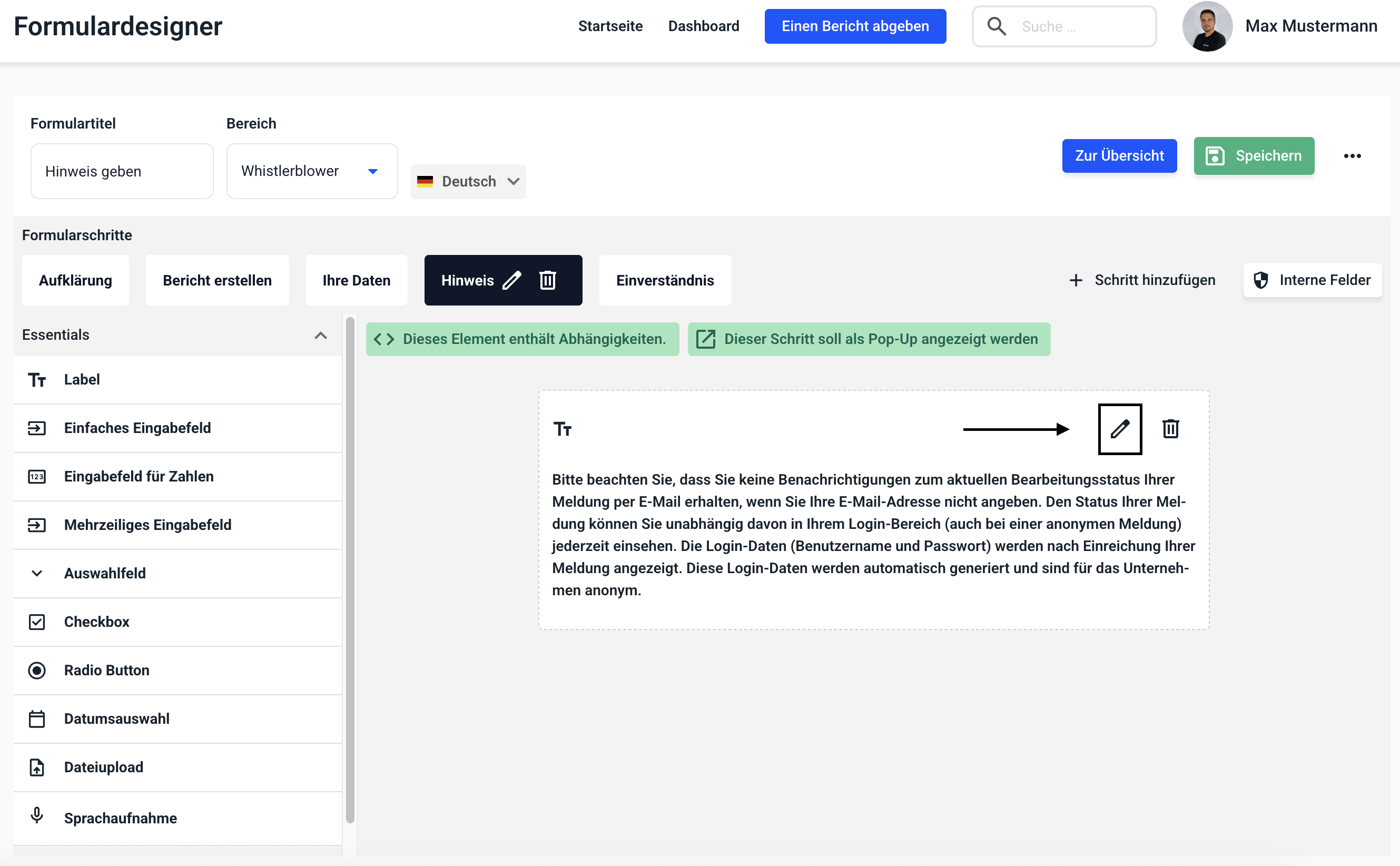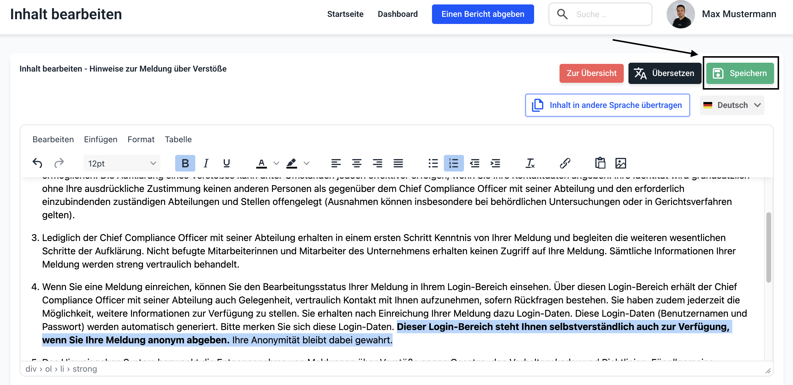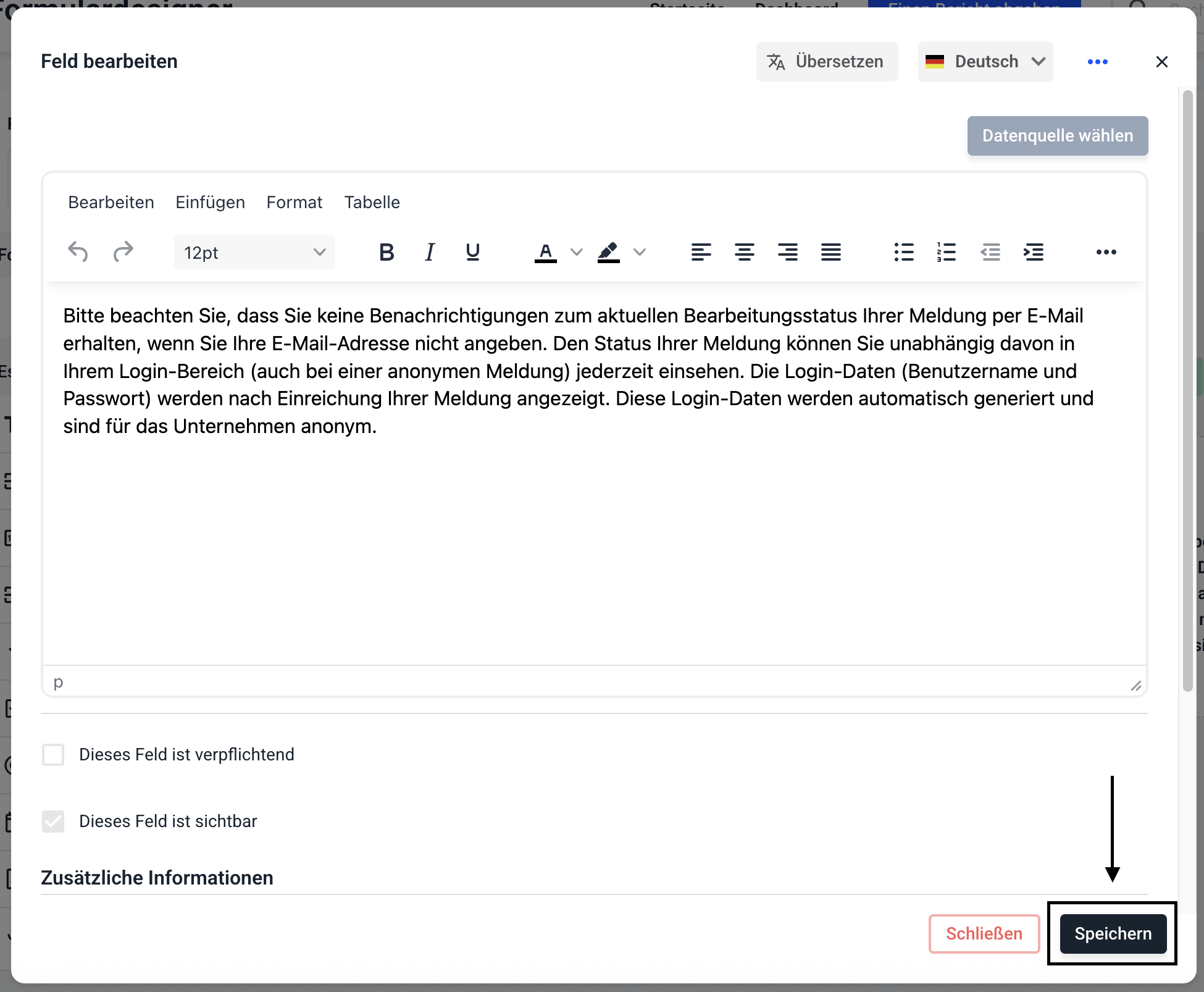 Wiederholen Sie das für die Texte Rechtliche Aufklärung zur Nutzung des Hinweisgebersystems und Hinweis über eingegangenen Bericht.