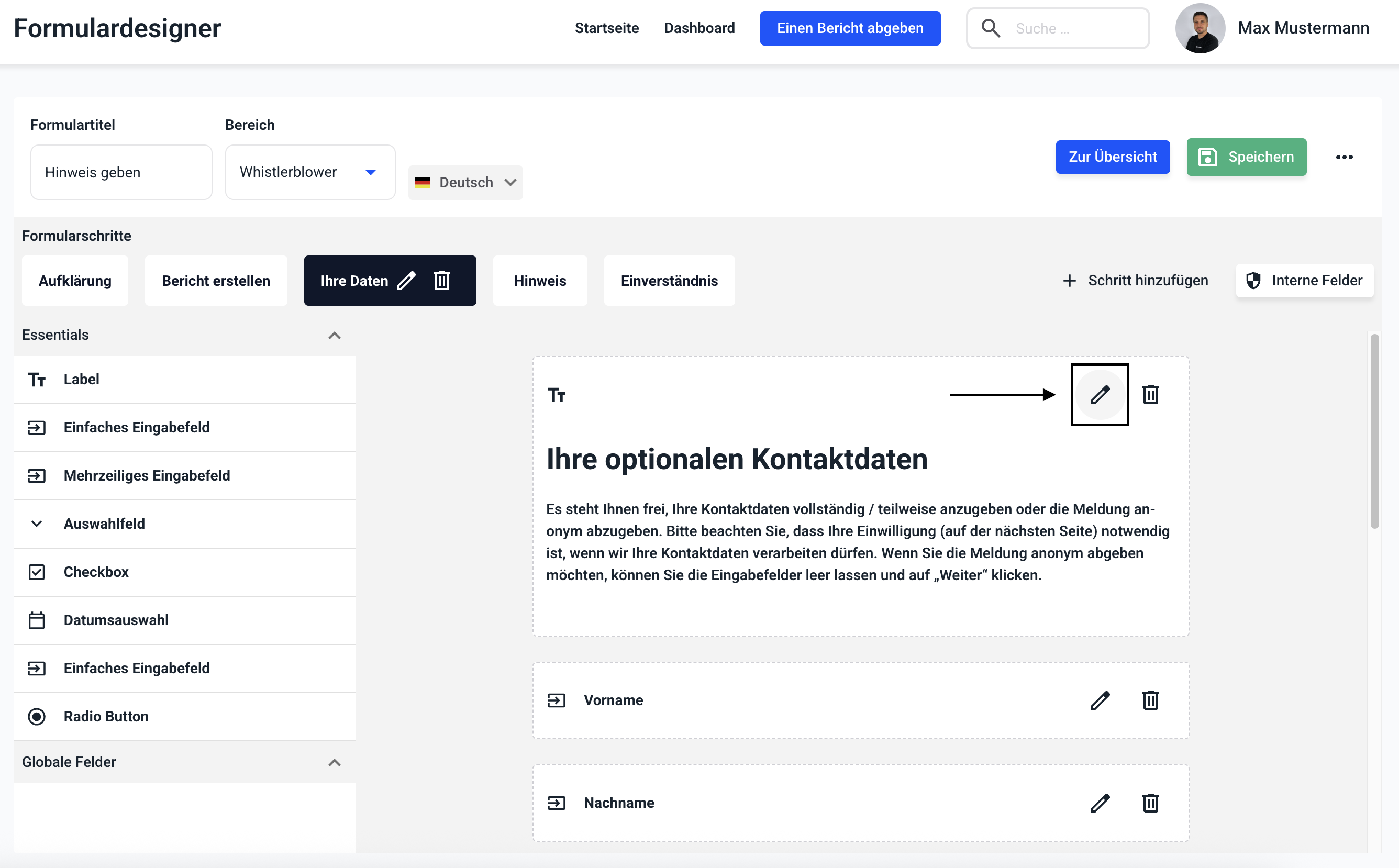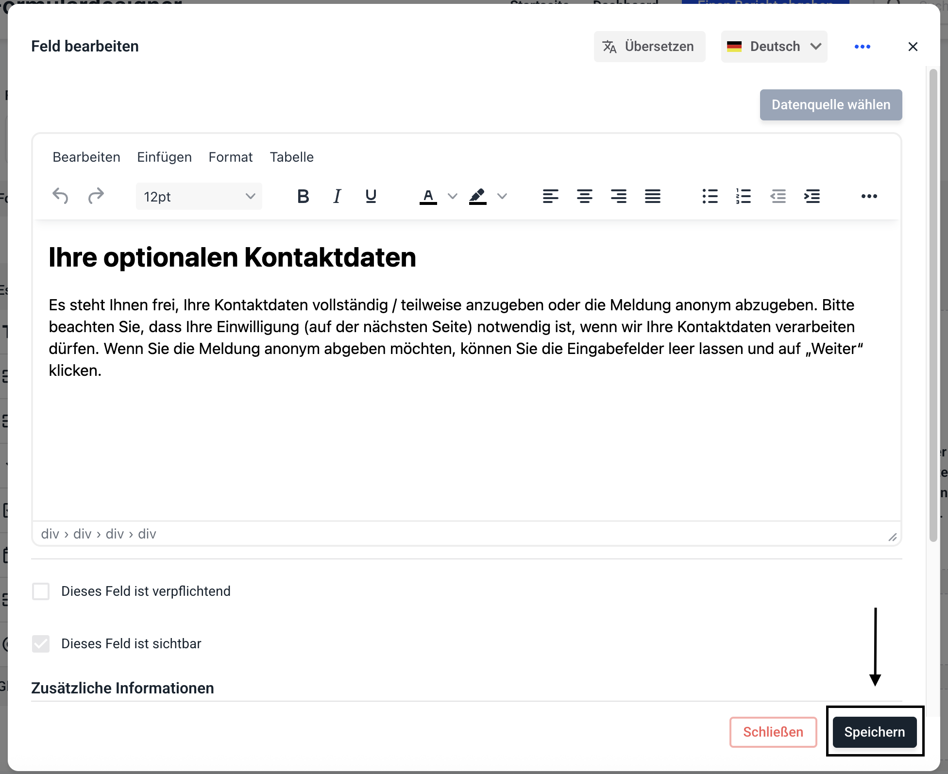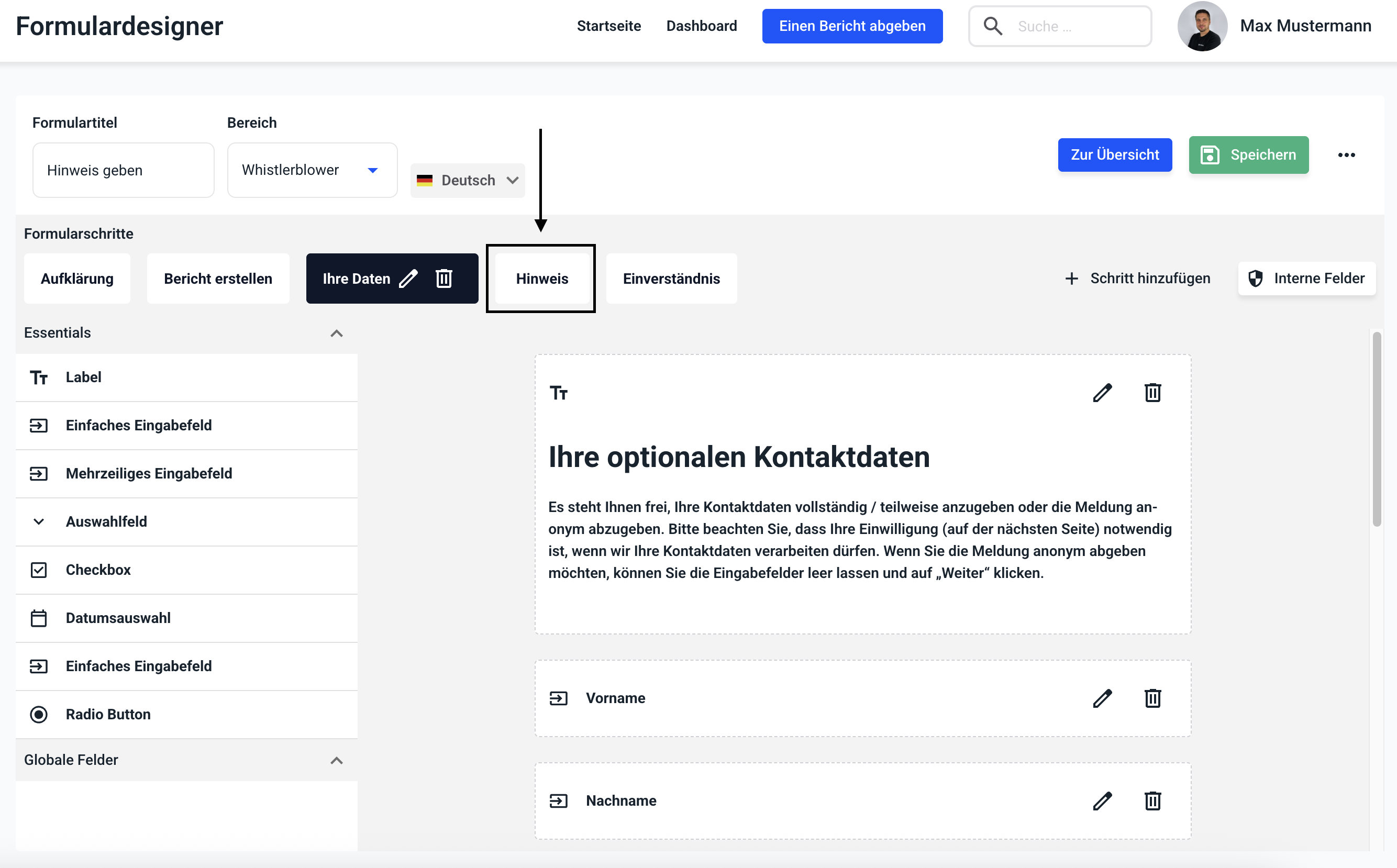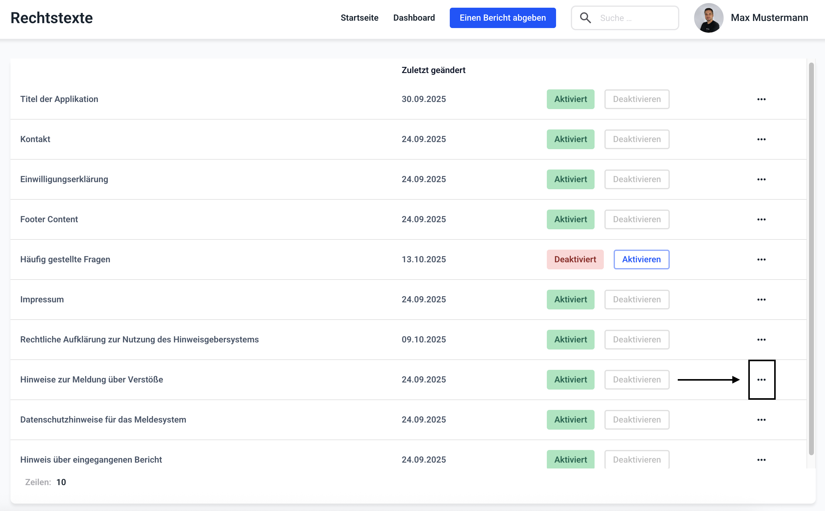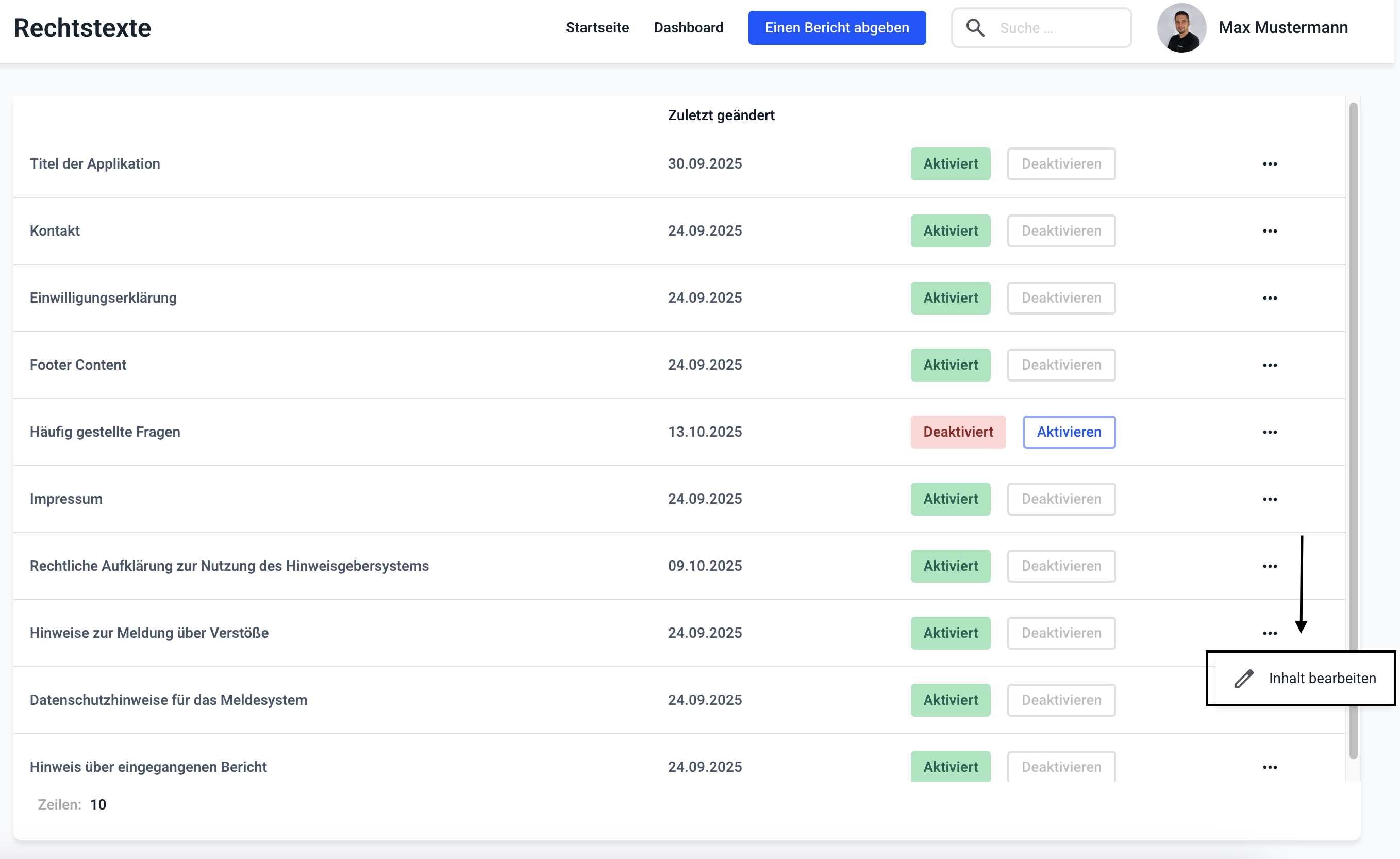 Wiederholen Sie das für die Texte Rechtliche Aufklärung zur Nutzung des Hinweisgebersystems und Hinweis über eingegangenen Bericht.