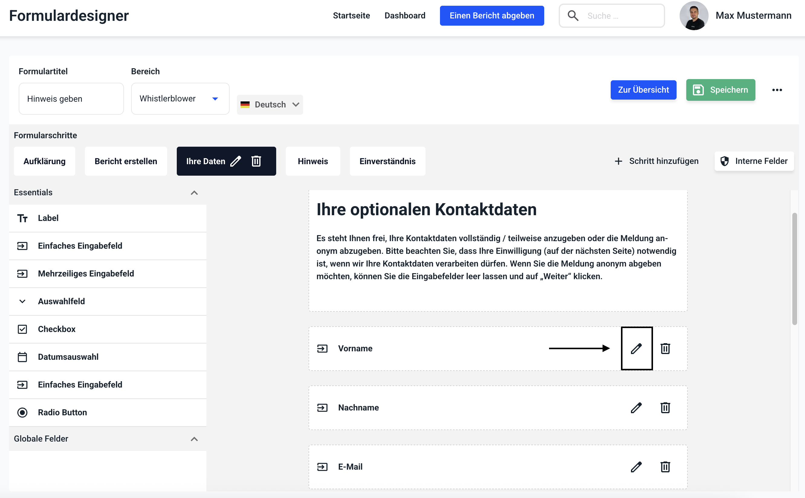 Um die Abgabe einer anonymen Meldung nicht zuzulassen, müssen Sie folgende Abschnitte verändern.