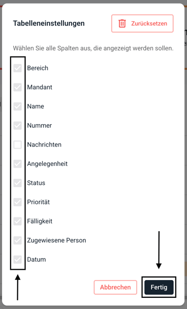 Anschließend öffnet sich ein Dialog in dem Sie entscheiden können welche Spalten Ihnen im Dashboard angezeigt werden sollen. Zum Entfernen von Spalten müssen Sie nur den Haken bei der jeweiligen Spalte abwählen oder zum Hinzufügen dementsprechend anwählen. Klicken Sie anschließend auf Fertig.