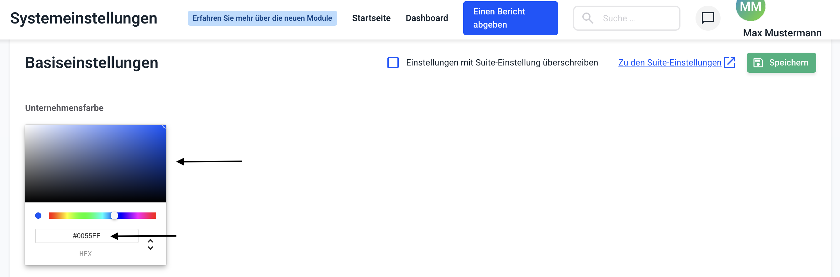 Die Farbe kann über einen Klick auf eine der dargestellten Farben ausgewählt werden oder über die Eingabe des Hexadezimalcodes in das Eingabefeld.