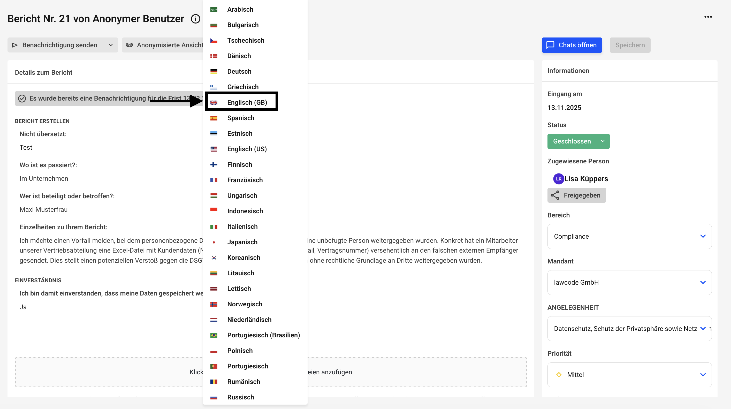 Sobald die übersetzte Sprache aus dem Auswahlfeld angeklickt wird, erhält man die übersetzten Hinweisinformationen (schwarz umrandet).