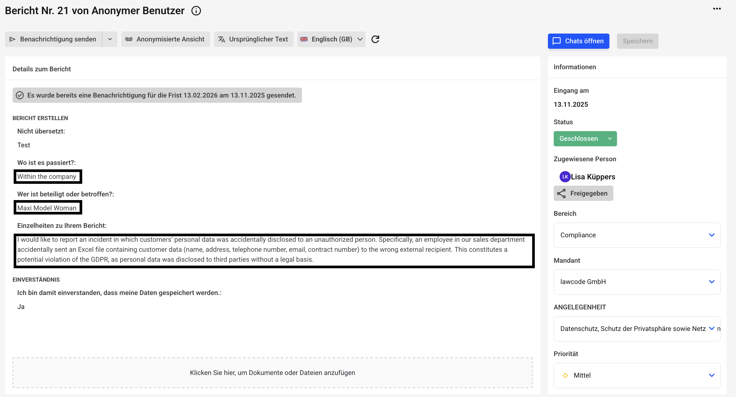 Sie können die Berichtsinformationen “Einzelheiten zu Ihrem Bericht“, “Wer ist beteiligt?“ und “Wo ist es passiert?“ einfach übersetzen in dem Sie auf den Button “Übersetzen“ klicken.