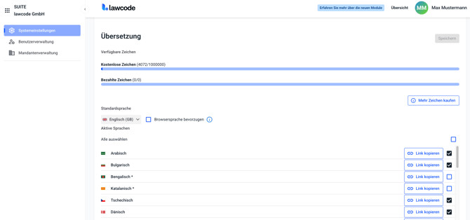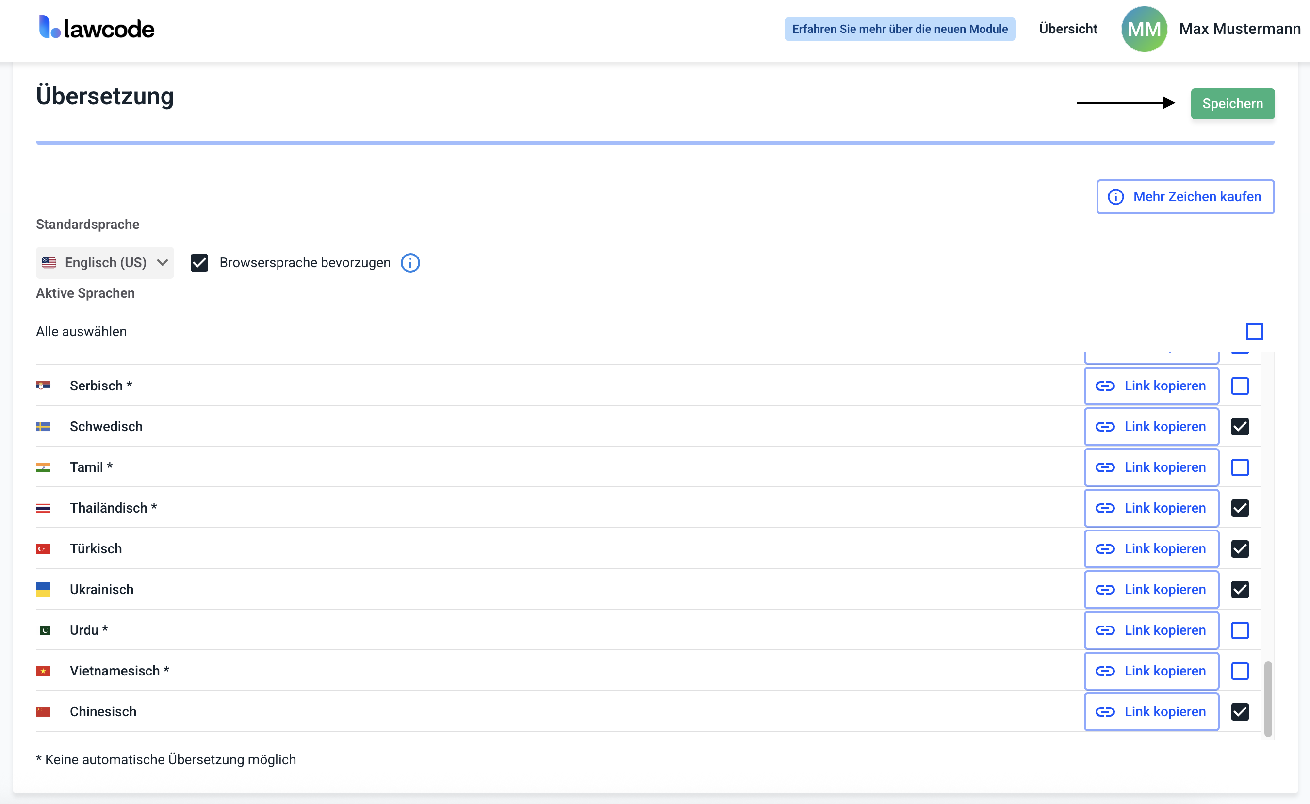 Mit einem Klick auf die Checkbox der jeweiligen Sprache kann diese ausgewählt werden.