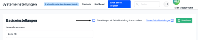 Bitte beachten Sie, dass die Systemeinstellungen in der Suite auf alle Module übertragen werden können. In den Systemeinstellungen der verschiedenen Module kann darauf ausgewählt werden, ob die Suite Systemeinstellungen übernommen werden sollen oder ob eine individuelle Anpassung für das bestimmte Modul vorgenommen werden soll.