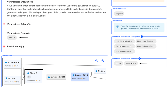 In dem EUDR-Manager haben Sie die Möglichkeit die Lieferkette des Produktes nachstellen zu können. Diese wird direkt innerhalb Ihres ausgewählten Produktes angezeigt.