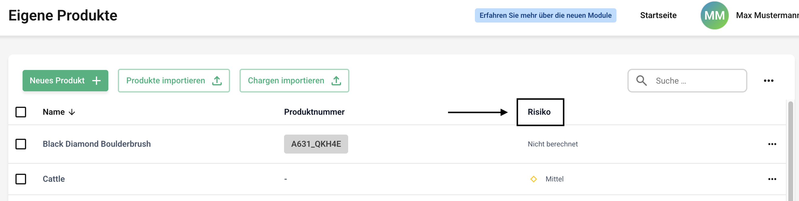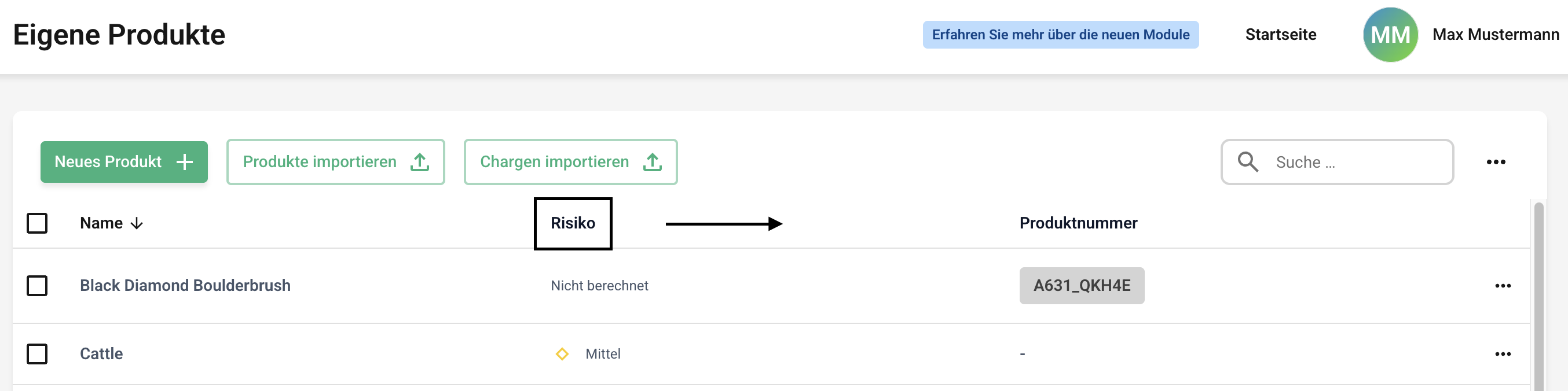Um die Spaltenansicht der Produkte zu verschieben, klicken Sie zunächst auf die Eigenen Produkte oder die Lieferantenprodukte.