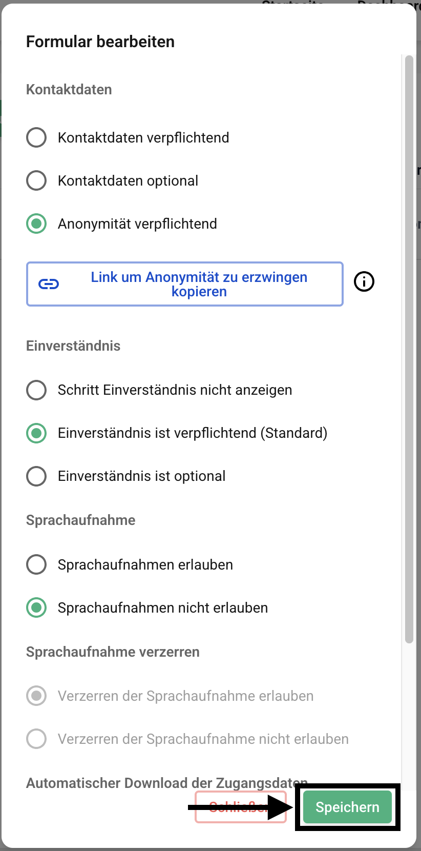 Auch für unsere Basic Kunden bieten wir die Möglichkeit, dass die hinweisgebenden Personen nicht die Möglichkeit haben eine Sprachaufnahme aufzuzeichnen. Diese Optionen ist standardmäßig gegeben und kann in der Formularverwaltung ausgeschaltet werden. Navigieren Sie dafür in die Formularverwaltung