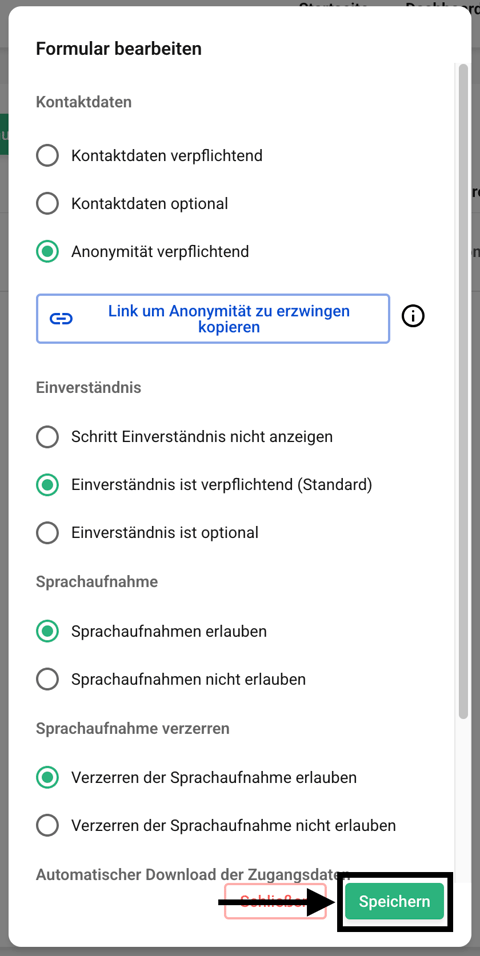 Auch für unsere Basic Kunden bieten wir die Möglichkeit, dass die hinweisgebenden Personen die Möglichkeit haben eine Sprachaufnahme zu vezrerren. Diese Optionen ist standardmäßig nicht gegeben und kann in der Formularverwaltung eingeschaltet werden. Navigieren Sie dafür in die Formularverwaltung.
