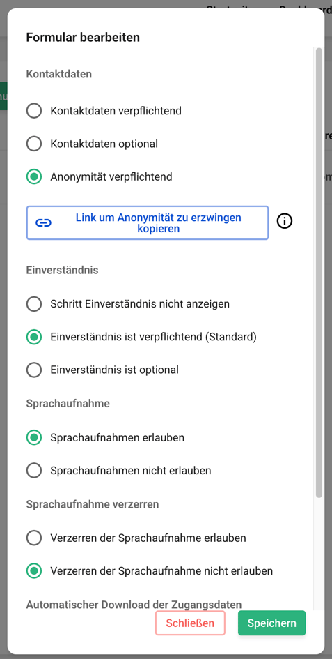 Wenn das Einverständnis optional ist, hat die Hinweisgebenden Person, die optional das Einverständnis nicht auszuwählen und zu bestätigen.