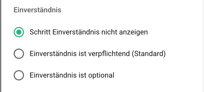 Wenn das Einverständnis nicht angezeigt wird, wird der Schritt der Einwilligungserklärung nicht im Formular ausgestrahlt.