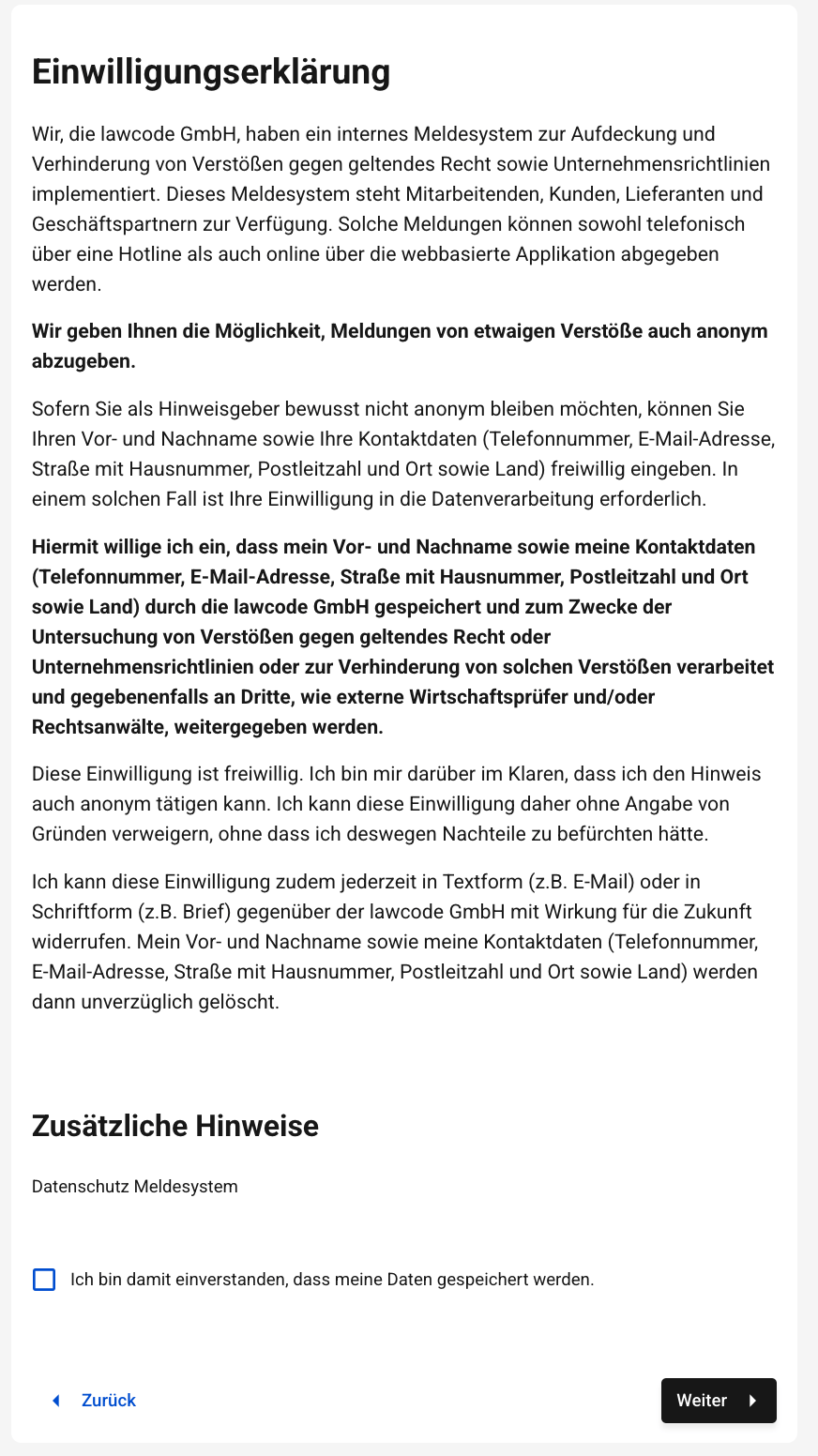 Wenn das Einverständnis verpflichtend ist, wird die Hinweisgebenden Person, bei der Fallabgabe verpflichtet, sein Einverständnis zum Speichern seiner Daten zu geben. Wie hier im Folgenden gezeigt.