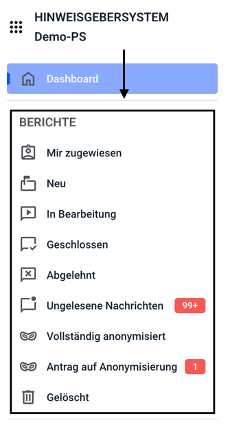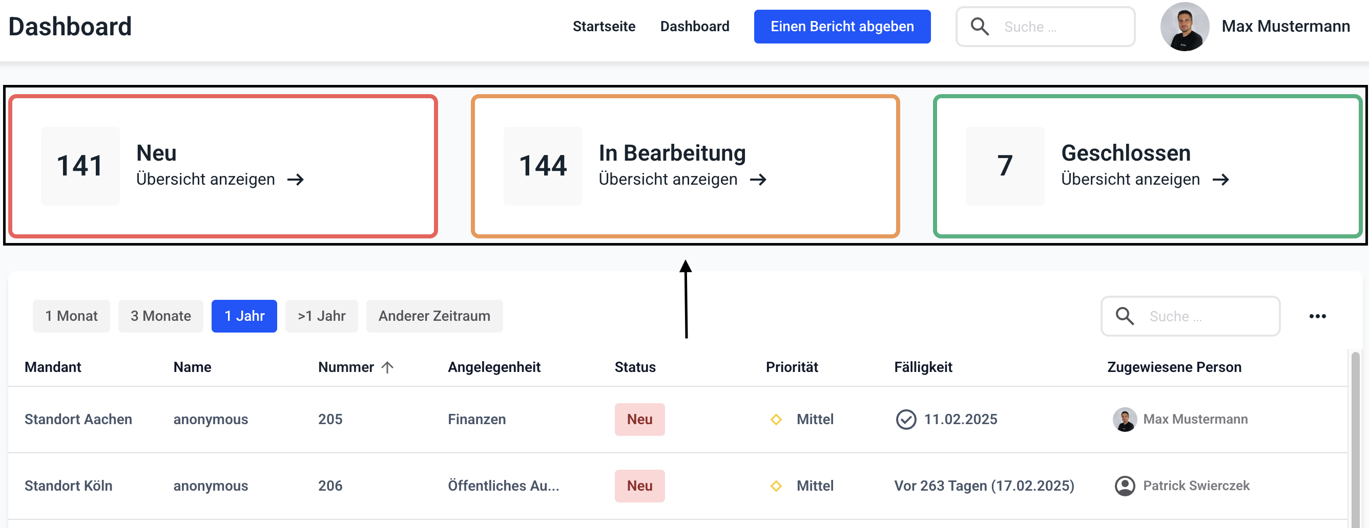 Sie können mit einem Klick auf eine der 3 Kacheln den Schnellzugriff zur Filterung nutzen. Über der Auflistung aller Hinweise im Dashboard haben Sie die Möglichkeit mit einem Klick alle Hinweise nach “Neu“, “In Bearbeitung“ oder “Geschlossen“ zu filtern.