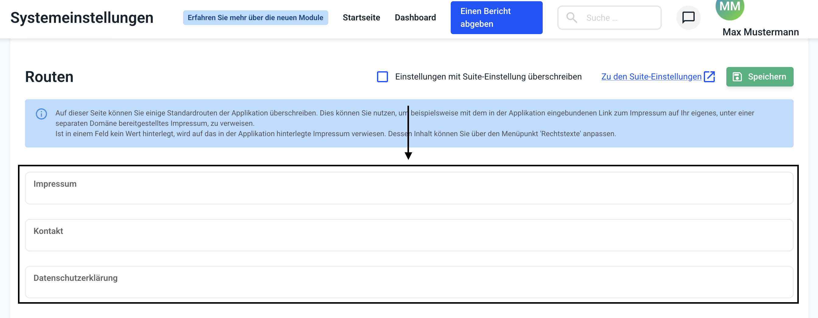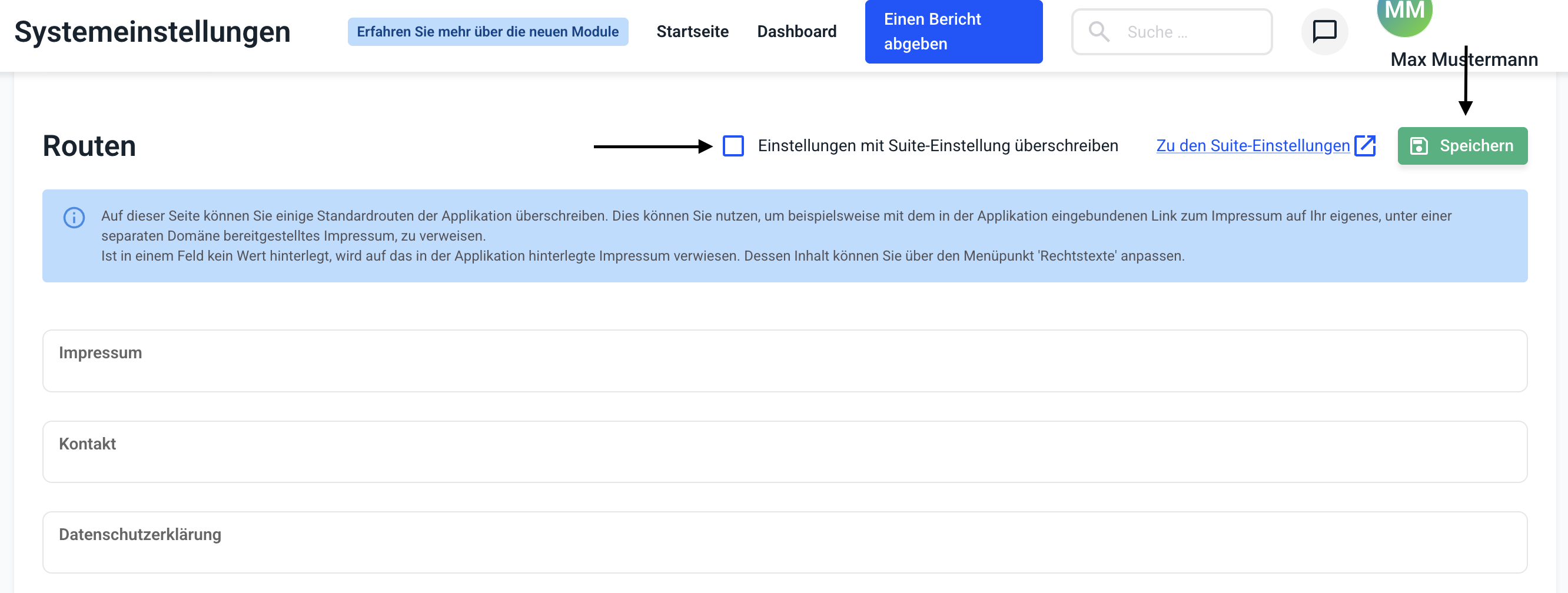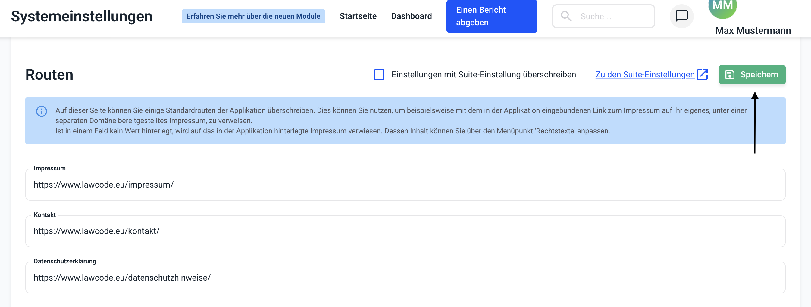 Auf dieser Seite können Sie einige Standardrouten des Hinweisgebersystems überschreiben. Dies können Sie nutzen, um beispielsweise mit dem im Hinweisgebersystem eingebundenen Link zum Impressum auf Ihr eigenes, unter einer separaten Domäne bereitgestelltes Impressum, zu verweisen.