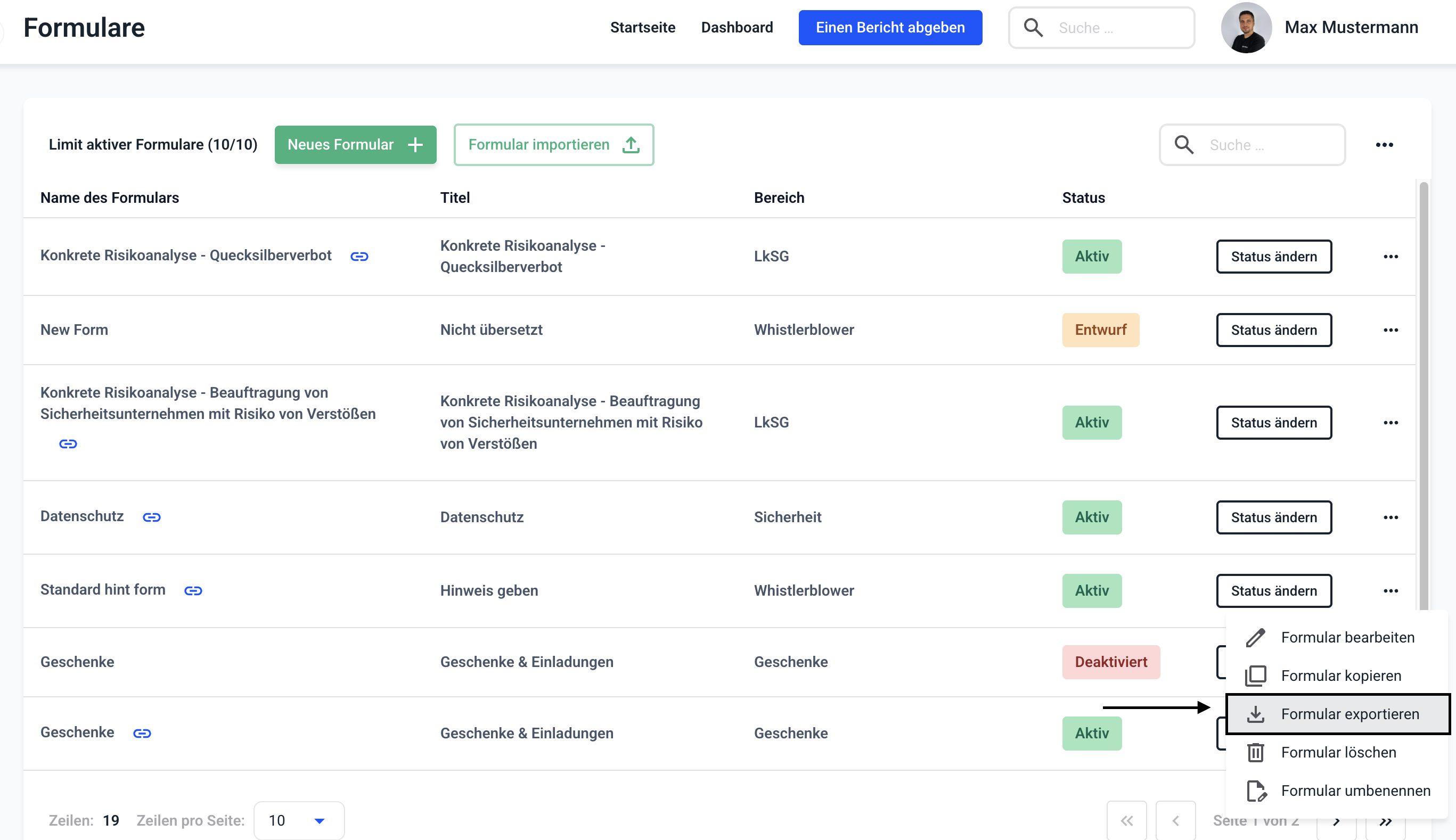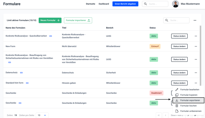 Wie kann ich ein Formular exportieren? HinSchG - Modul