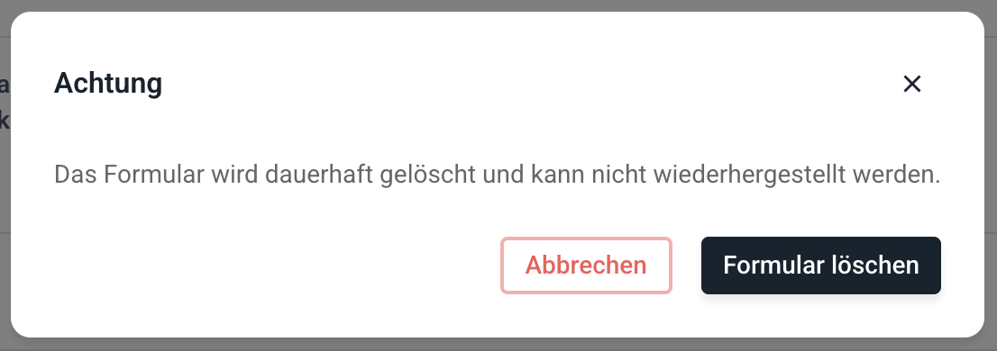 Es erscheint ein Warnfenster, indem Sie die Löschung final bestätigen müssen. Sobald Sie auf Formular löschen klicken, wird das Formular entgültig gelöscht.
