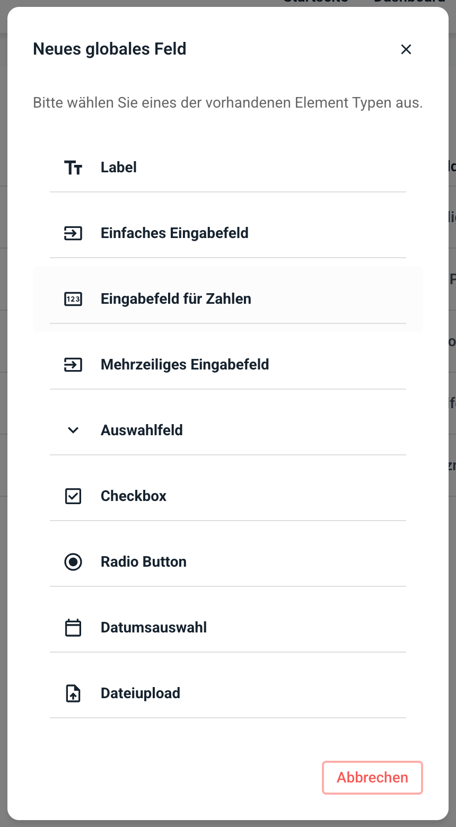 Wählen Sie die Art des Feld aus, dass das globale Feld werden soll.