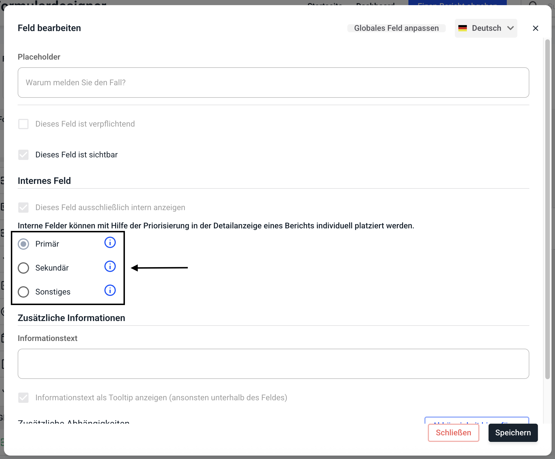Wenn Sie die sekundäre Variante wählen, wird das Feld auf der rechten Seite unter den internen Feldern angezeigt.