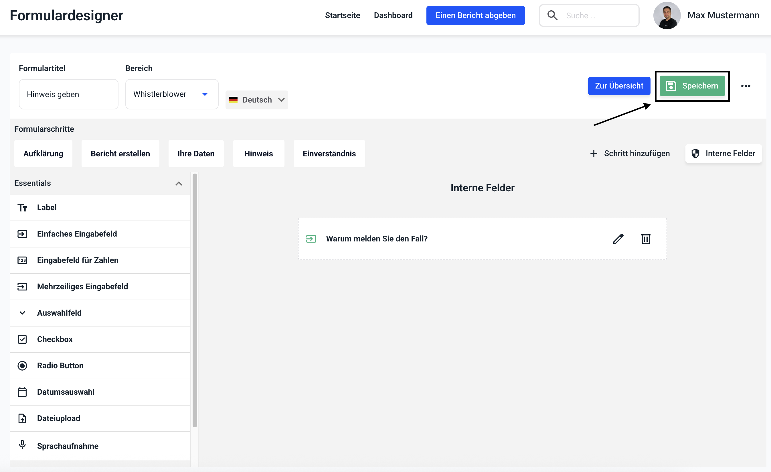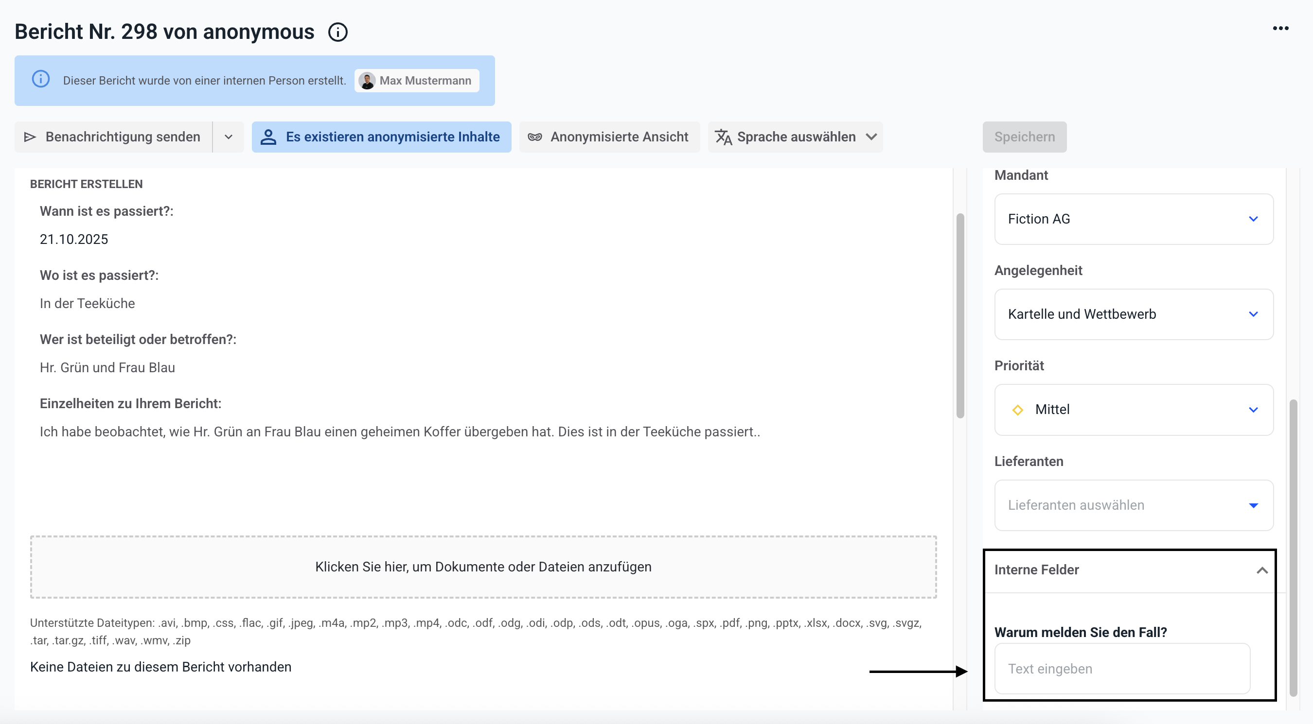 Bei der primären Variante wird das Feld unter der Nachricht des Hinweisgebers angezeigt.