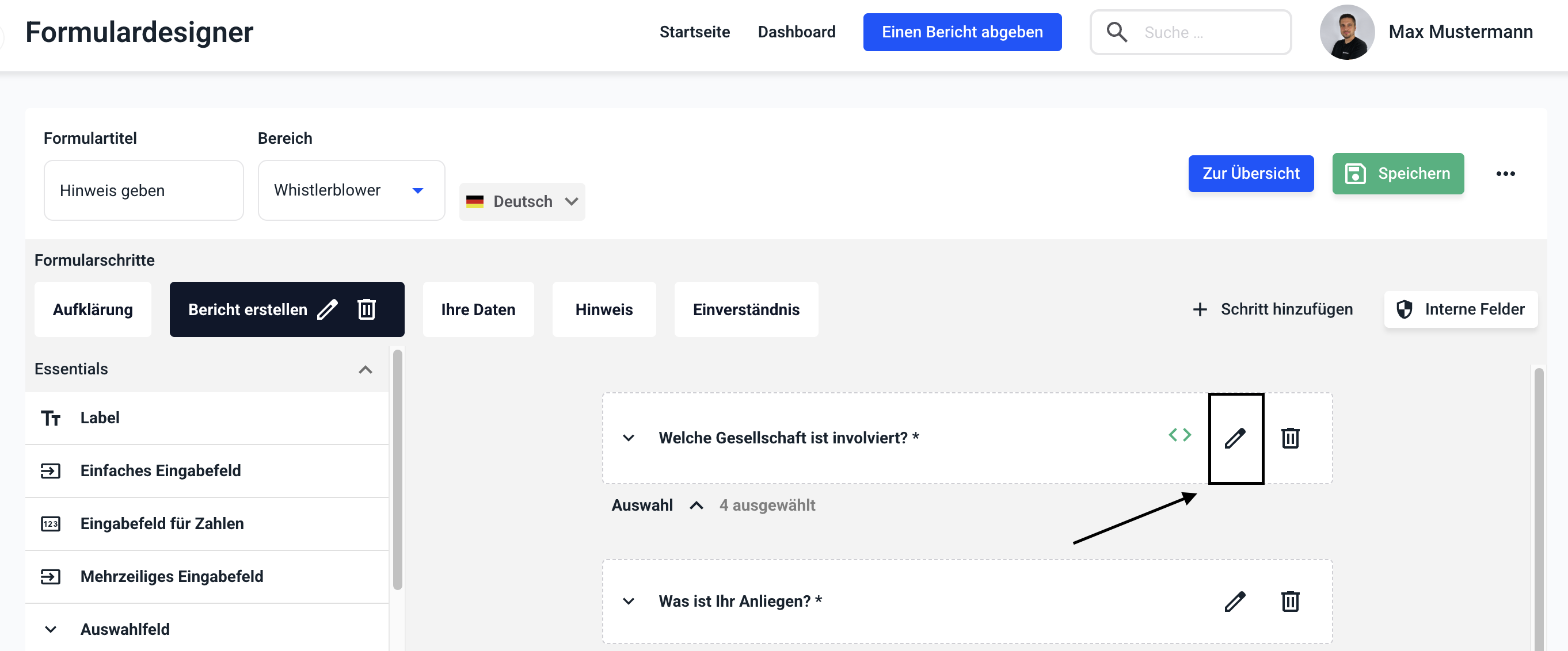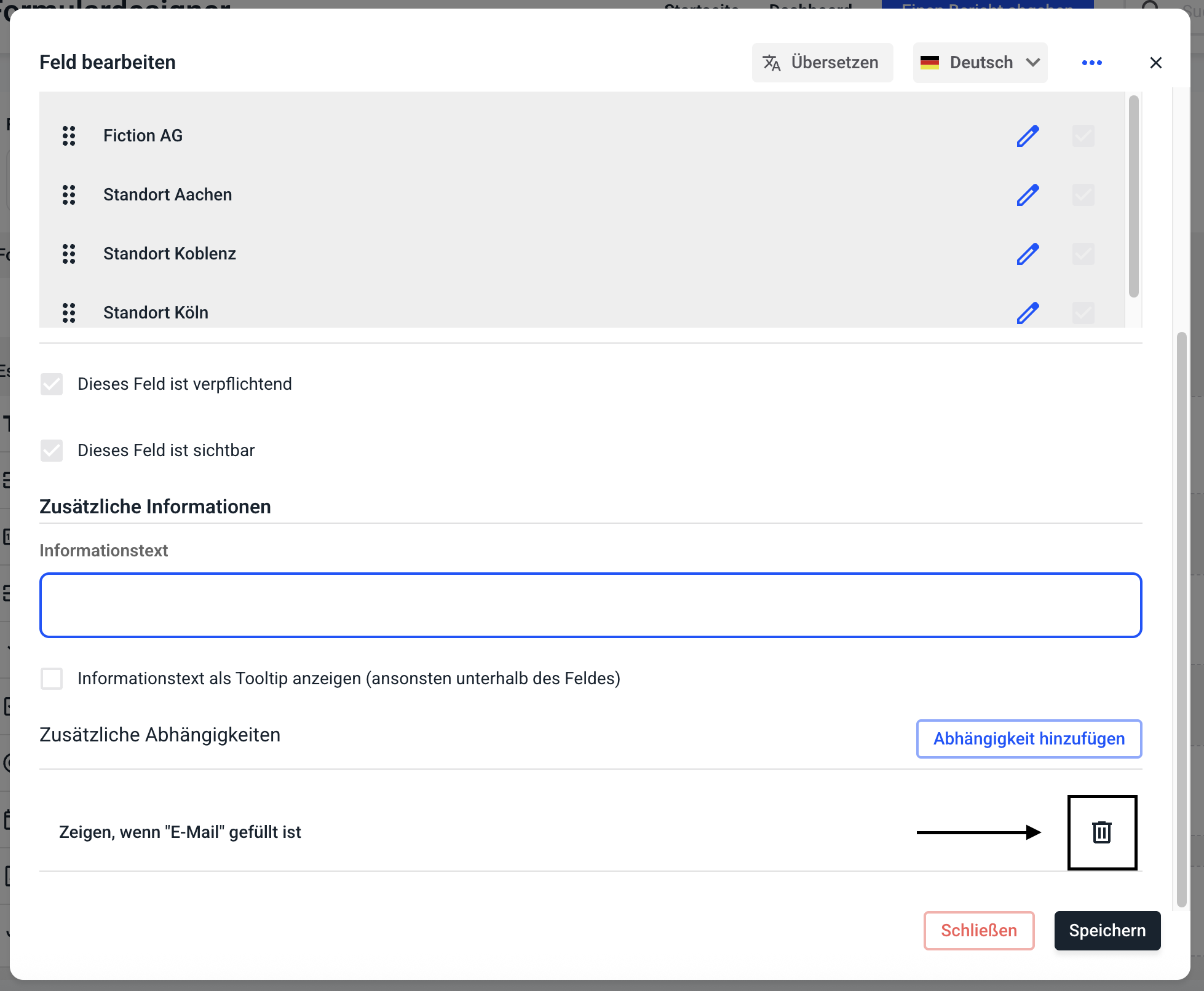 Wählen Sie das Feld aus, dem Sie eine Abhängigkeit entfernen möchten. Klicken Sie dafür auf den Bearbeitungsstift des Feldes.