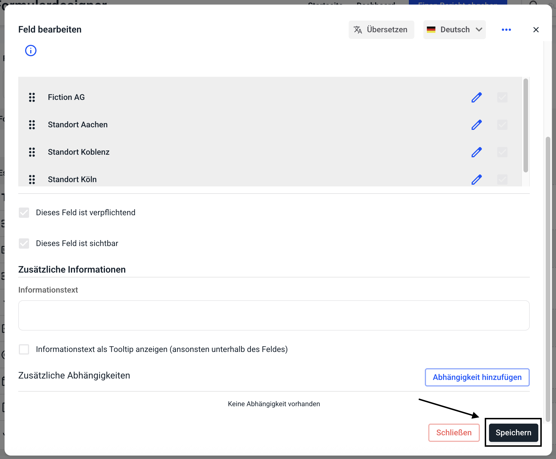 Die Abhängigkeit wurde nun entfernt. Klicken Sie auf Speichern, um die Änderung im Feld zu speichern.