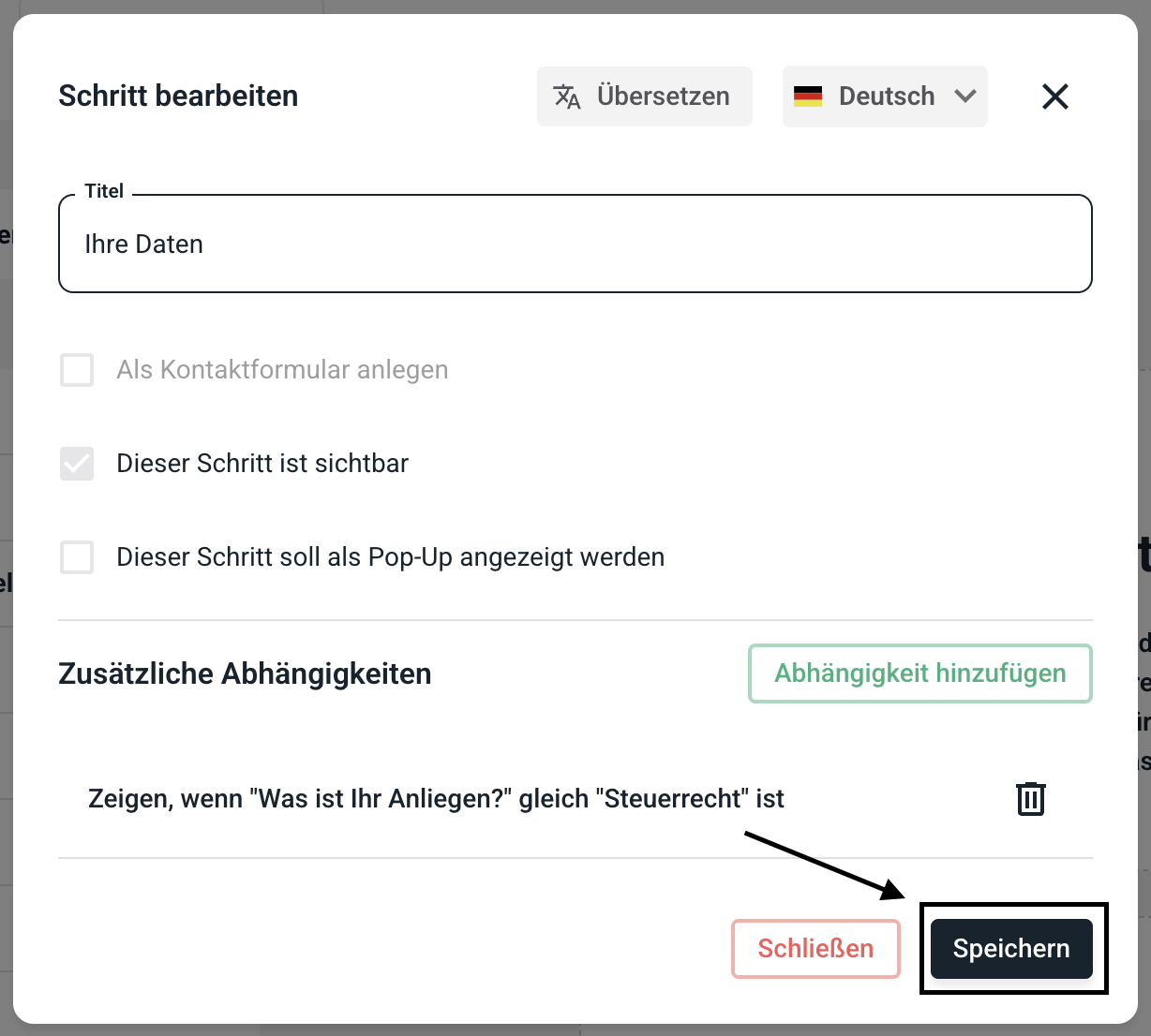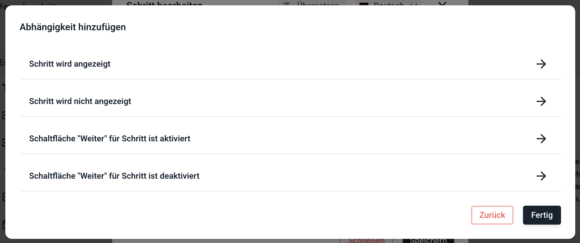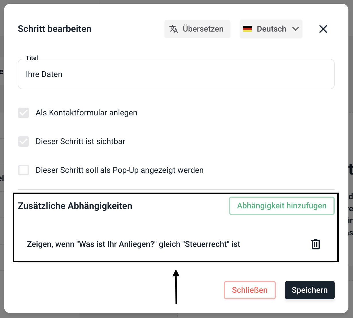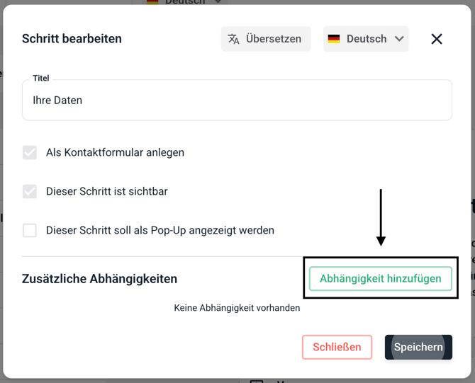 Die Abhängigkeit wurde nun hinzugefügt. Der Schritt wird jetzt nur angezeigt, wenn die Abhängigkeit erfüllt wird. Es können unendliche Abhängigkeiten in einem Schritt hinzugefügt werden.