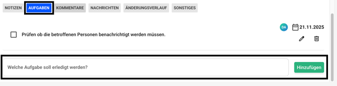 Zu einem Hinweis können Aufgaben erfasst werden, klicken Sie dazu in der Hinweisdetailansicht auf “Aufgaben“ anschließend sollte sich die Aufgabenübersicht öffnen.