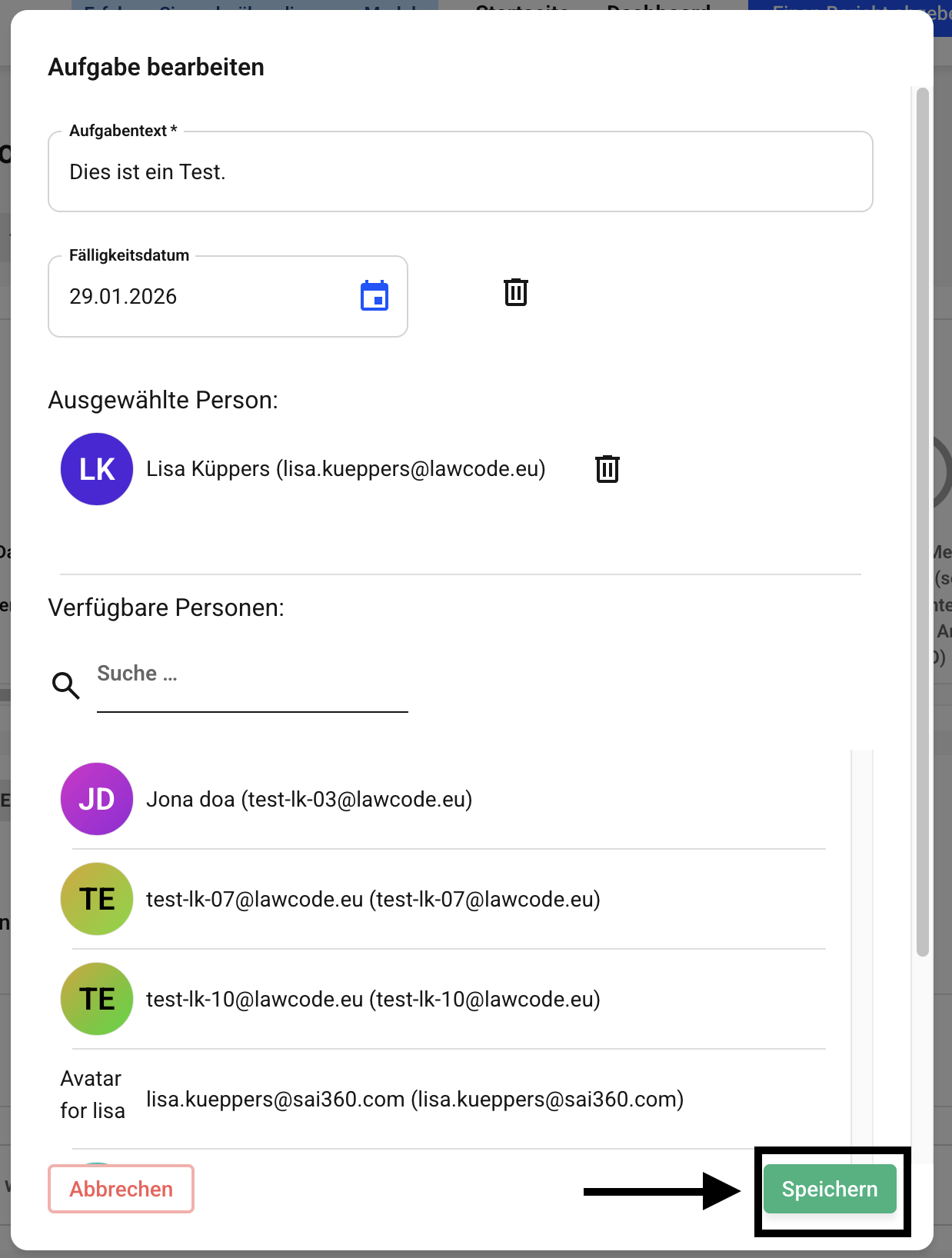 Nachdem Klick öffnet sich der Bearbeitungsdialog hier können Sie zum Beispiel den Aufgabentext, Fälligkeitsdatum und die zuständige Person anpassen und auswählen.